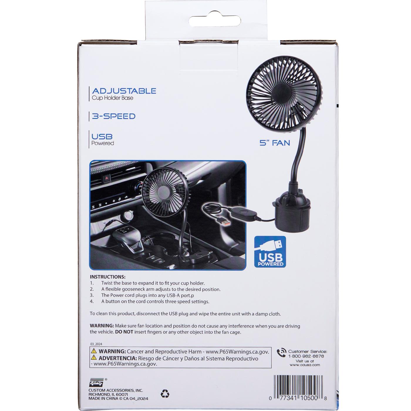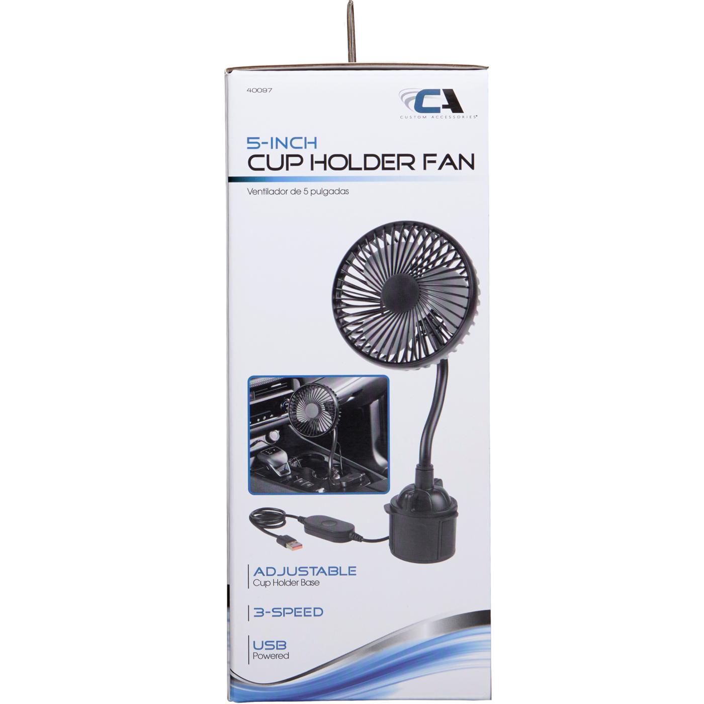 Make your rides more chill with the Custom Accessories 5-inch Cup-Mount Fan. The innovative design features an adjustable mechanism that controls the diameter of the base, allowing you to produce a snug, custom fit inside most vehicle cup holders. It's powered by a standard USB-A plug that fits into standard USB outlets and select plug-in chargers, making it an ideal alternative to battery-operated models. A convenient switch is integrated into the design that allows for low, medium, and high-speed use. Protected by a sturdy blade guard to prevent accidental touching, the head can be tilted at a variety of angles to focus the air where it's needed. Installation takes mere seconds in cars, trucks, SUVs, and more. Beat the heat while you're on the go with the Custom Accessories 5-inch Cup-Mount Fan.