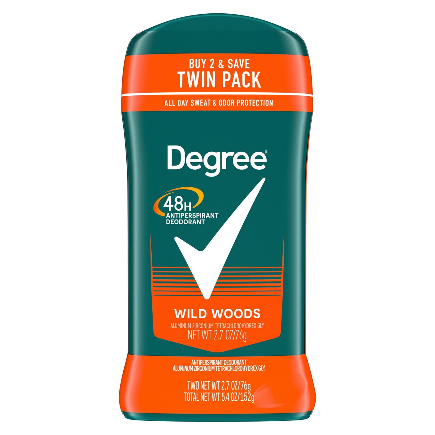 Degree men wild woods antiperspirant deodorant delivers 48-hour sweat and odor protection to keep you feeling dry and fresh. This antiperspirant for men works as hard as you do and offers 48-hour sweat and odor protection, so you can take on the day. Our wild woods antiperspirant deodorant features a soothing kick of crisp citrus blended with sandalwood. This powerful antiperspirant deodorant responds when you need it most, so you can stay confident without having to worry about slowing down. You can be confident you'll be protected from sweat and odor by this antiperspirant for men. Simply twist, glide, and get moving. The crisp, refreshing scent helps to keep you as fresh as when you started your day. Stay dry, cool, and confident from morning to night thanks to degree men wild woods antiperspirant deodorant. At degree, we want to inspire the confidence in everyone to move more and go further. We're here to support your journey through an antiperspirant that moves with you and helps you go beyond your limits. As well as increasing our use of reusable materials, we're making it easier for you to recycle our antiperspirant and dry spray packaging. Degree. It won't let you down.