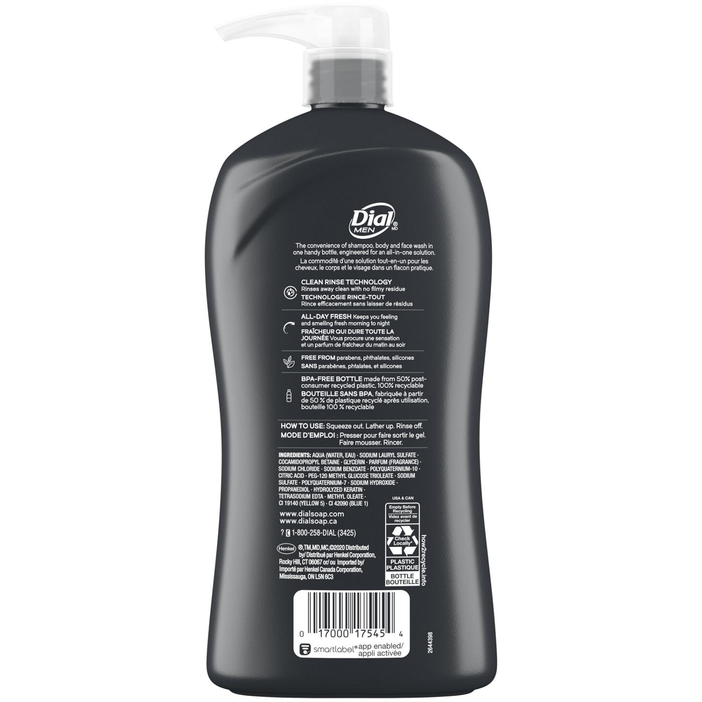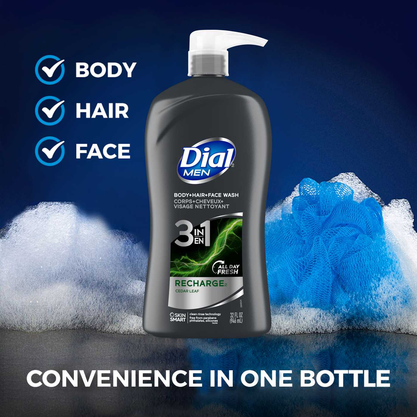 Start your day with the no-nonsense clean of Dial Men Recharge 3in1 Body, Hair and Face Wash. The convenience of shampoo, body and face wash in one handy bottle, engineered for an all-in-one solution. With its clean rinse technology and rich, creamy lather, you know you’ll be all-day fresh. Dial Men Skin Smart formulas are made to be free from parabens, phthalates and silicones, leaving skin looking and feeling hydrated and healthy. With a recyclable bottle you can feel good about, and a cedar leaf scent that will leave you feeling fresh all day. Formulated with Clean Rinse Technology for a clean shower feel that rinses away clean without a filmy residue.- MULTIBENEFIT: Dial Men 3-in-1 formula for your hair, body and face. One bottle, one solution for all your shower needs- CLEAN RINSE TECHNOLOGY: For that just-showered feel, with a lather that rinses away clean without a filmy residue- ALL DAY FRESH: Keeps you feeling and smelling fresh long after you've showered- RICH LATHER: engineered to lather up rich and and clean deep without drying- RECYCLABLE: Every Dial Men body wash bottle is recyclable, BPA-Free and made from 50% Post-Consumer Recycled Plastic
