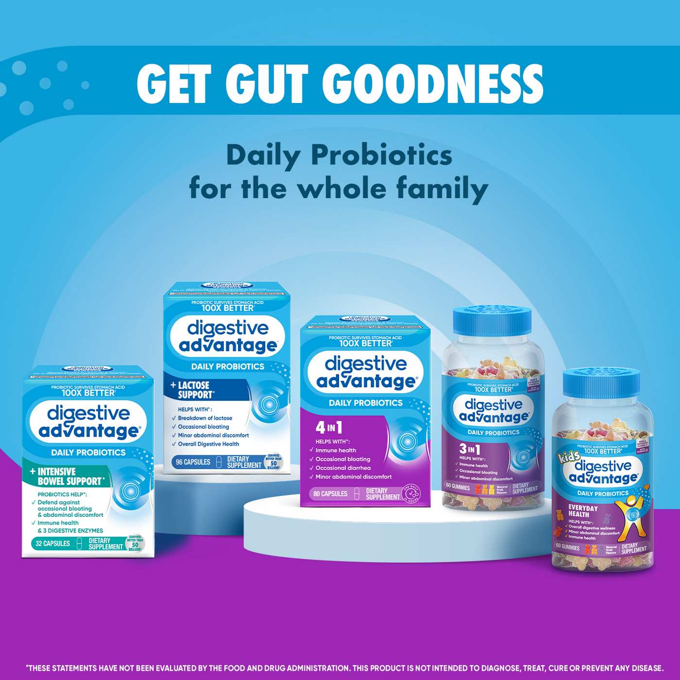 Digestive Advantage Probiotic Gummies are the easiest and most delicious way to get your daily probiotics while targeting your specific digestive health needs. Digestive Advantage helps to lessen minor abdominal discomfort, bloating and may relieve occasional diarrhea*. The unique patented probiotic in Digestive Advantage Probiotic Gummies, BC30, is protected by a protein shell which allows it to survive through the harsh conditions of your stomach to reach the intestines where you need it most to promote long term digestive and immune health*. It's the probiotic supplement that survives stomach acid 100x better than yogurt and leading probiotics** *These statements have not been evaluated by the Food and Drug Administration. This product is not intended to diagnose, treat, cure or prevent any disease. **Based on median % survivability of Digestive Advantage probiotic vs. leading probiotic supplements and 19 probiotic yogurts in simulated gastric PH for 2 hours. Survivability and delivery of probiotic cells to the small and large intestines is one of the several factors influencing overall product effect.