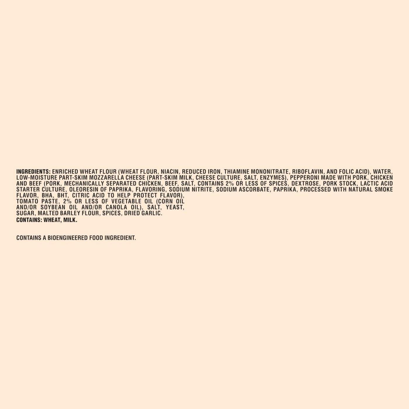 ENRICHED FLOUR (WHEAT FLOUR, MALTED BARLEY FLOUR, NIACIN, REDUCED IRON, THIAMINE MONONITRATE, RIBOFLAVIN, FOLIC ACID), WATER, LOW-MOISTURE PART-SKIM MOZZARELLA CHEESE (PART-SKIM MILK, CHEESE CULTURE, SALT, ENZYMES), PEPPERONI MADE WITH PORK, CHICKEN AND BEEF (PORK, MECHANICALLY SEPARATED CHICKEN, BEEF, SALT, CONTAINS 2% OR LESS OF SPICES, DEXTROSE, PORK STOCK, LACTIC ACID STARTER CULTURE, OLEORESIN OF PAPRIKA, FLAVORING, SODIUM NITRITE, SODIUM ASCORBATE, PAPRIKA, PROCESSED WITH NATURAL SMOKE FLAVOR, BHA, BHT, CITRIC ACID TO HELP PROTECT FLAVOR), TOMATO PASTE, 2% OR LESS OF VEGETABLE OIL (CORN OIL AND/OR SOYBEAN OIL AND/OR CANOLA OIL), SALT, YEAST, SUGAR, SPICES, DRIED GARLIC.Allergens and safety warnings