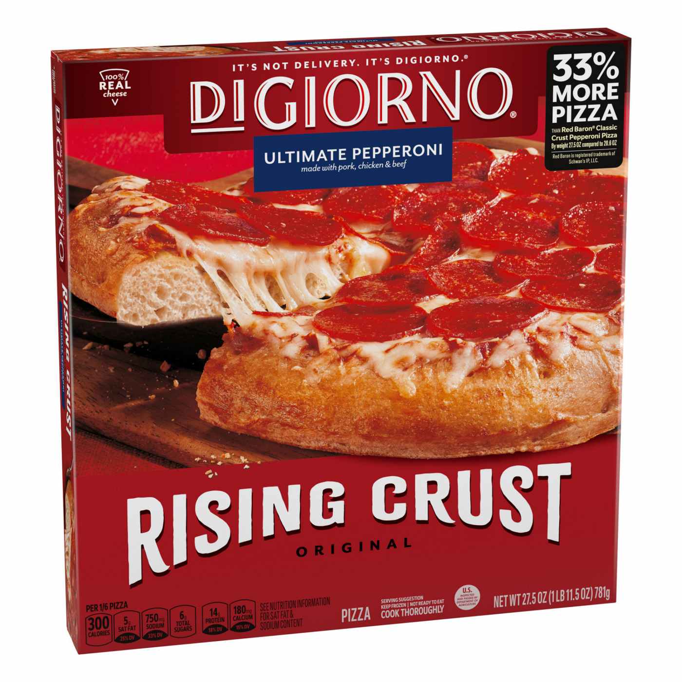 • PEPPERONI PIZZA DONE OUR WAY: DiGiorno Pepperoni Rising Crust Frozen Pizza topped with zesty tomato sauce, mozzarella cheese, and slices of pepperoni made with pork, chicken and beef for that delivery taste right at home• RISING STYLE CRUST: Get that delicious, crispy on the outside but soft and tender on the inside crust you love from delivery right at home with this easy-to-make DiGiorno pizza• READY IN JUST 19 MINUTES: Toss this DiGiorno frozen pizza onto the center oven rack, bake for nineteen minutes at 400°F and let stand 5 minutes before serving. Then enjoy this pepperoni pizza with big flavors• A SATISFYING LUNCH, DINNER OR SNACK: Includes one 24.7oz DiGiorno pizza with tomato sauce, 100% real mozzarella cheese, and ultimate pepperoni made with pork, chicken and beef• IT’S NOT DELIVERY: Enjoy all the delicious flavors of your favorite pepperoni pizza from delivery in one, rising crust DiGiorno frozen pizza. It’s not delivery, it’s DiGiorno• REGENERATIVE AGRICULTURE: DiGiorno is partnering with family run wheat farms to speed the adoption of regenerative agriculture practices to create a better future for farmers. Regenerative agriculture practices can include planting cover crops, eliminating or reducing tillage, and reducing the use of pesticides