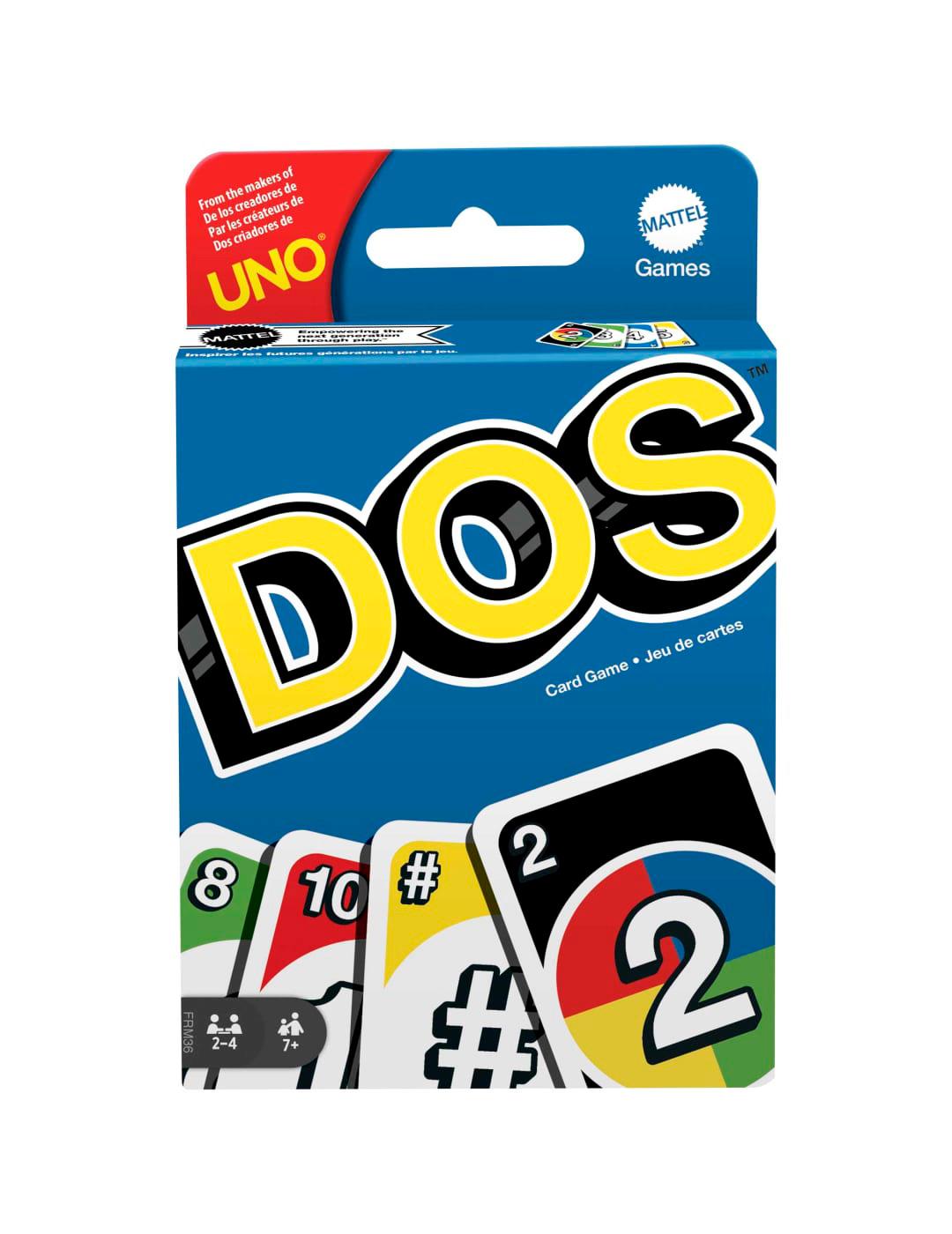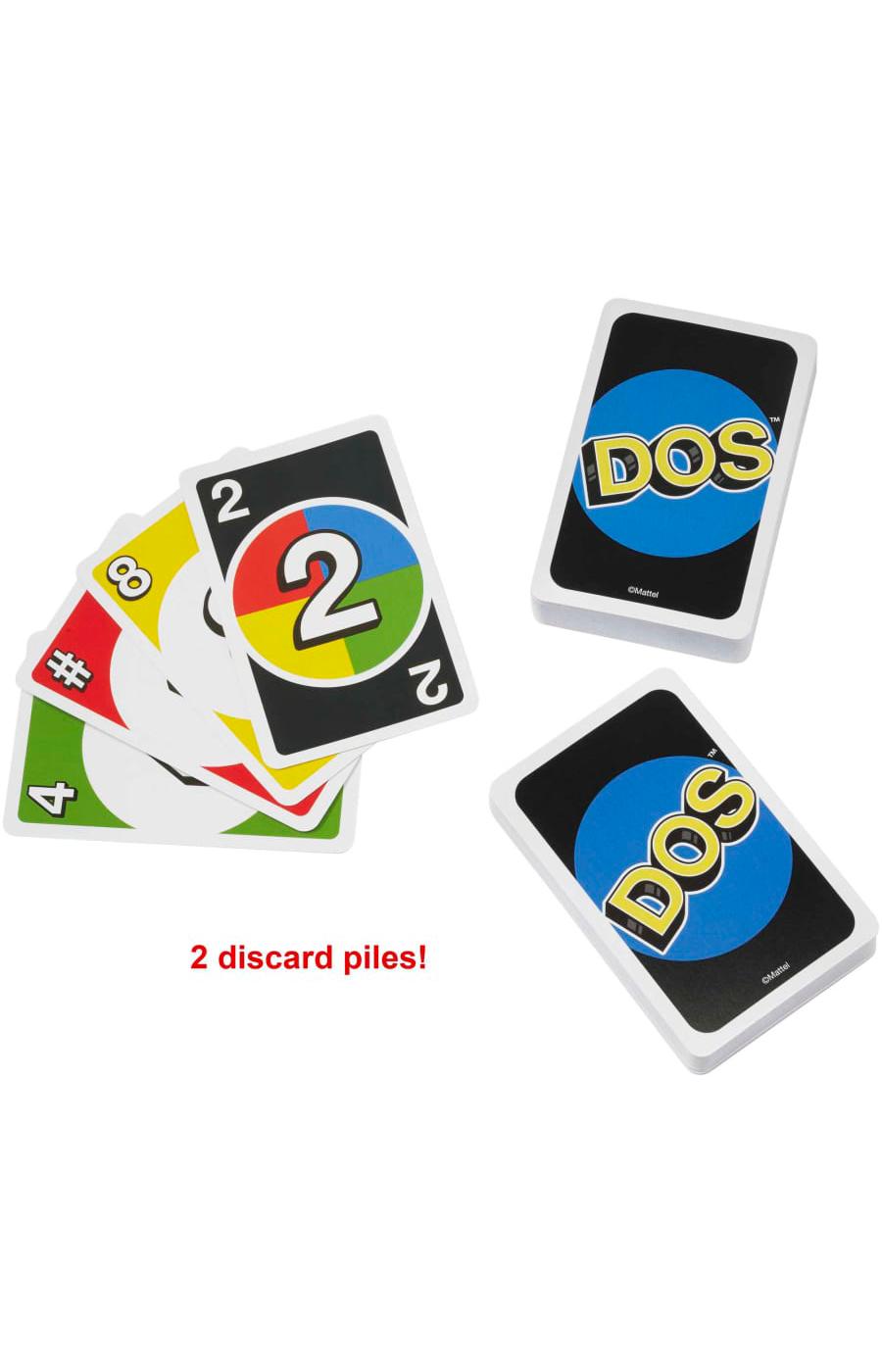UNO™ has a new best friend, DOS™! In this fun card game, two is more important than one, and number matching is king! Just like UNO™, DOS™ involves a race to be the first to get rid of your cards. To start, there are two discard piles between the players. On each player's turn they can discard on either pile with either one or two cards, so if a player has two cards that add up to the number of a card in the center pile, they are able to put down BOTH cards. When you're down to two cards, don't forget to yell 'DOS!' The first person to 200 points is the winner!