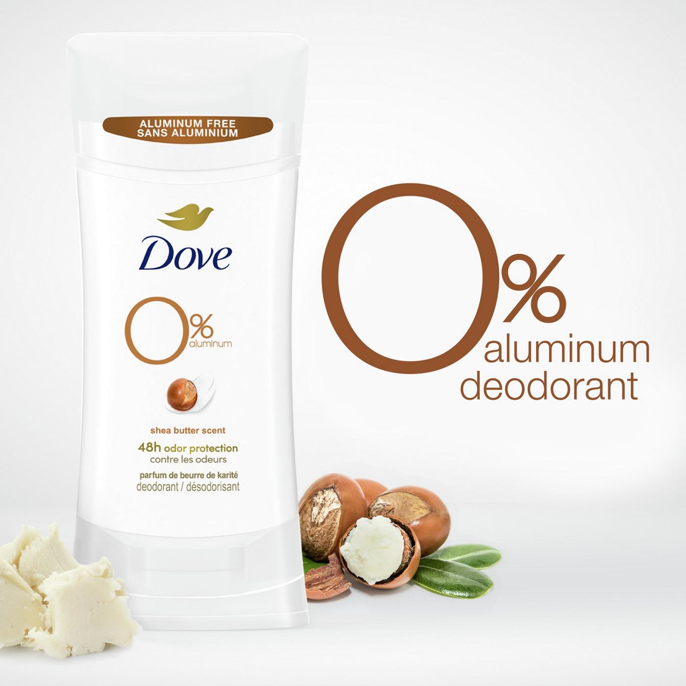 To keep your underarms feeling their best every day, they need the same love and care you give the rest of your body. Dove 0% Aluminum Deodorant Stick Shea Butter is the most skin-kind aluminum-free deodorant, with no compromise on odor protection. So, when you use this 0% alcohol (ethanol) deodorant formula, you always get the protection youd expect, and the care your delicate underarms deserve from an aluminum free deodorant.Enriched with ¼ moisturizers, this gentle, non-irritating deodorant without aluminum works to give you soft, smooth underarms by caring for your skin. In addition to underarm care, Dove 0% aluminum deodorant provides effective odor protection. Designed to protect your underarms from odor for up to 48-hours, one application of this 0% alcohol (ethanol) deodorant formula will help you get on with your day worry free.Smelling fresh and clean all day is a great way to boost your confidence. Infused with a comforting shea butter scent, this deodorant without aluminum gives long-lasting freshness with every application, leaving you feeling and smelling great, no matter what the day brings.To get the most out of your deodorant stick without aluminum, swipe evenly onto clean, dry skin after showering and enjoy fresh-smelling underarms.Made to be small and compact, this aluminum-free deodorant stick is ideal when youre on-the-go. Just pop into purses and desk drawers for easy access whenever youre in need of a quick refresh.Dove believes that no young person should be held back from reaching their full potential. Since 2004, Dove has been building self-esteem in young people and by 2030, theyll have helped ¼ billion through our educational programs.
