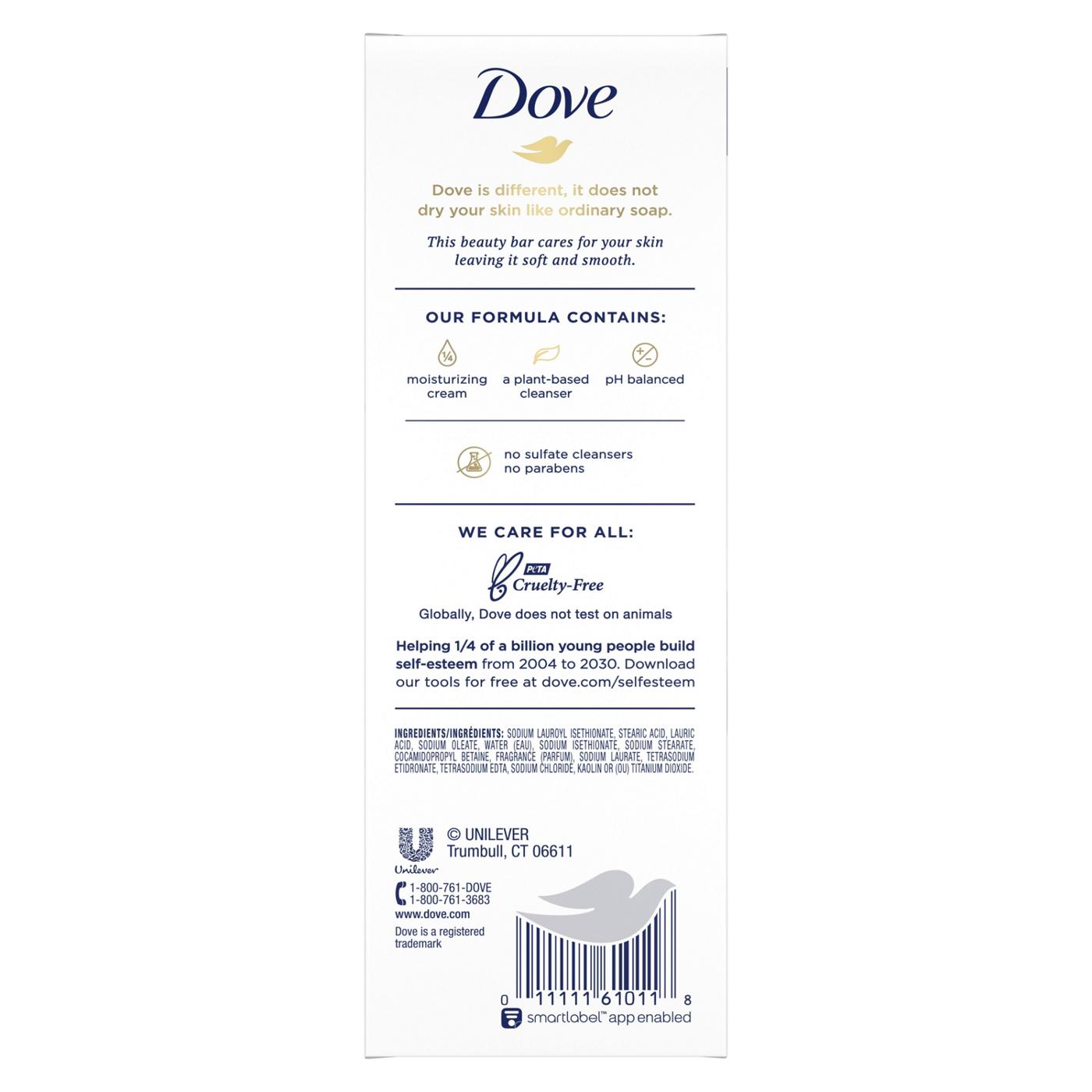 The original Dove Beauty Bar is a classic choice for gentle cleansing that moisturizes your skin. Its mild formula is designed to replenish your skin's natural moisture, leaving it feeling soft and smooth after every use. This package of six beauty bars is suitable for the whole family to use.• Formulated with 1/4 moisturizing cream• Mild cleansers help skin retain its natural moisture• Leaves skin feeling softer and smoother than ordinary bar soap• Gentle enough for daily use on the body and face