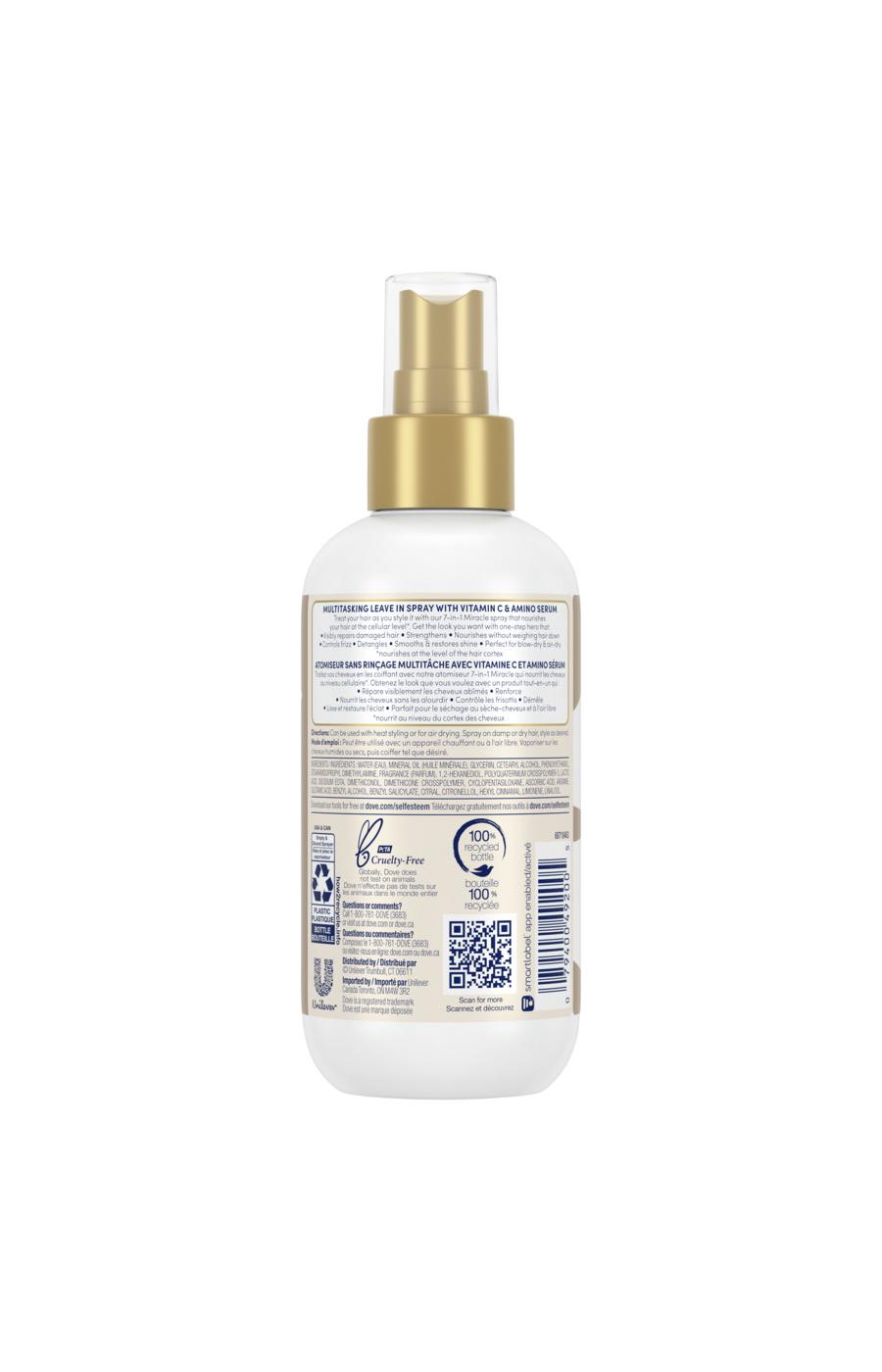 Brushing, styling, heat, pollution – your hair goes through a lot. Dove Hair Therapy 7-in-1 Miracle Mist gives your hair a little extra TLC that it deserves. Formulated with vitamin C and amino serum, this multi-benefit, leave-in hair care spray is perfect for treating over-processed or damaged hair that's prone to breakage and split ends. Treat your hair as you style with Dove Hair Therapy 7-in-1 Miracle Mist, a leave-in hair spray that visibly repairs, strengthens and nourishes hair without weighing it down. It also controls frizz, detangles, smooths and restores shine, making the perfect styling, hair care and hairspray addition. The Dove Hair Therapy 7-in-1 Miracle Mist features potent moisturizers and nourishing ingredients that go to the hair's cellular level and leaves hair feeling beautifully cleansed, smooth and healthy – a great addition to your hair products. Nourishes at the level of hair's cortex. How to use: Simply spray Dove Hair 7-in-1 Miracle Mist onto dry or damp hair and style as desired. Want 2X visibly fuller and thicker hair? Try our Dove Hair Therapy Strength & Fullness Shampoo and Conditioner. For hair with that envious shine, try Dove Hair Therapy Glow & Restore Shampoo and Conditioner.