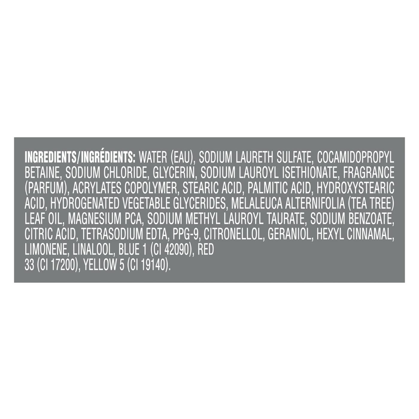 Water (Eau), Sodium Laureth Sulfate, Cocamidopropyl Betaine, Glycerin, Sodium Chloride, Sodium Lauroyl Isethionate, Fragrance (Parfum), Stearic Acid, Palmitic Acid, Hydroxystearic Acid, Menthol, Mentha Piperita (Peppermint) Leaf Extract, Magnesium PCA, Acrylates Copolymer, Sodium Benzoate, Tetrasodium EDTA, Citric Acid, PPG-9, Benzyl Salicylate, Citronellol, Coumarin, Hexyl Cinnamal, Blue 1 (CI 42090), Red 33 (CI 17200).Allergens and safety warnings