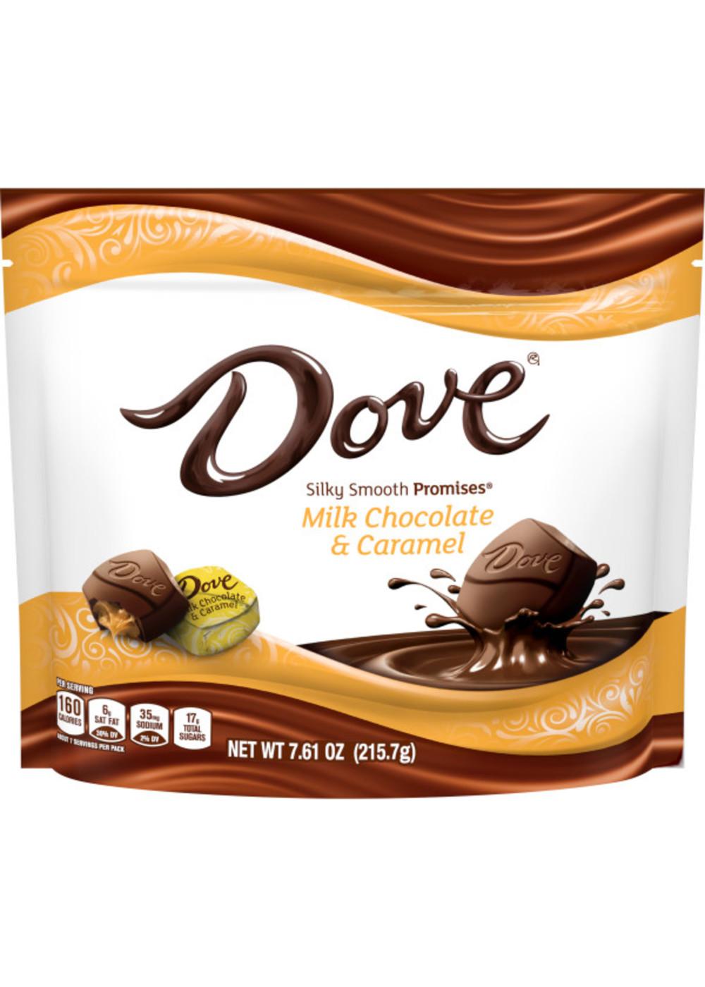 • Contains one (1) 7.61-ounce bag of Dove Promises Caramel and Milk Chocolate Candies• Dove Promises Candies with milk chocolate and caramel make a perfect dessert• Each individually foil-wrapped Dove Promises Candy contains a sweet message and makes great favors and gifts• Share a bag of Dove Promises with friends and family to spread a quality treat that everyone will love• Each bag has a resealable zipper for easy storage