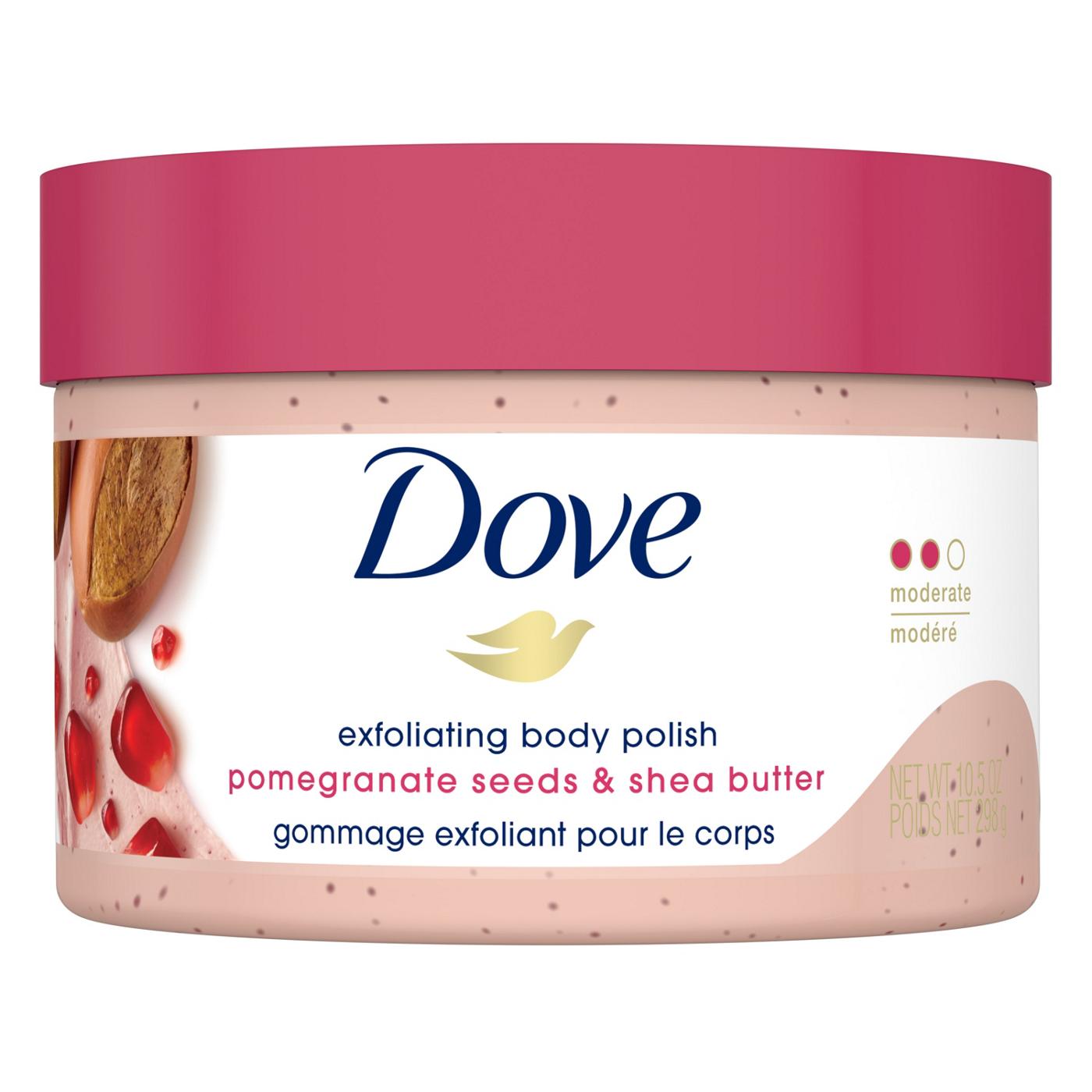 • MODERATE EXFOLIATION - Made with beach sand-sized exfoliating particles, Dove Exfoliating Body Polish Pomegranate & Shea Butter is smooth and easily spreadable with a mild lather