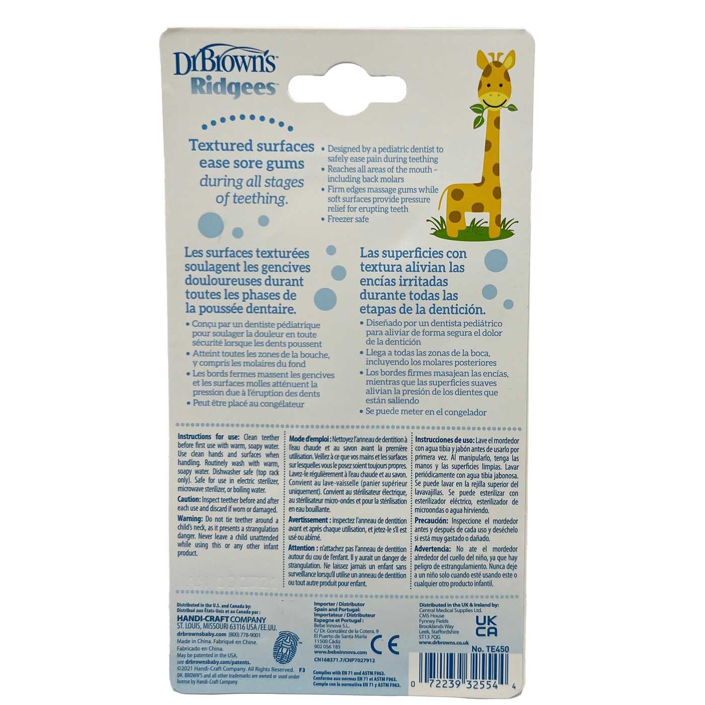 Get baby's mouth moving against teething pain with Dr. Brown's Ridgees' Giraffe Teether. Help baby work out pain and discomfort with the bitable, chewable Ridgees' Teether, designed by a pediatric dentist. The adorable giraffe design features firm edges that massage sore gums and a surface that offers pressure relief from erupting teeth. The Ridgees' Giraffe is a multi-textured teether that eases pain and discomfort for baby. The teether reaches safely into all areas of baby's mouth for complete oral soothing. Use as a cold teether by placing Ridgees in the fridge on extra sore days to give baby cooling relief. The silicone teether is dishwasher safe (top rack) and sterilizer friendly, making clean up a breeze. For infants 3m+. BPA free.