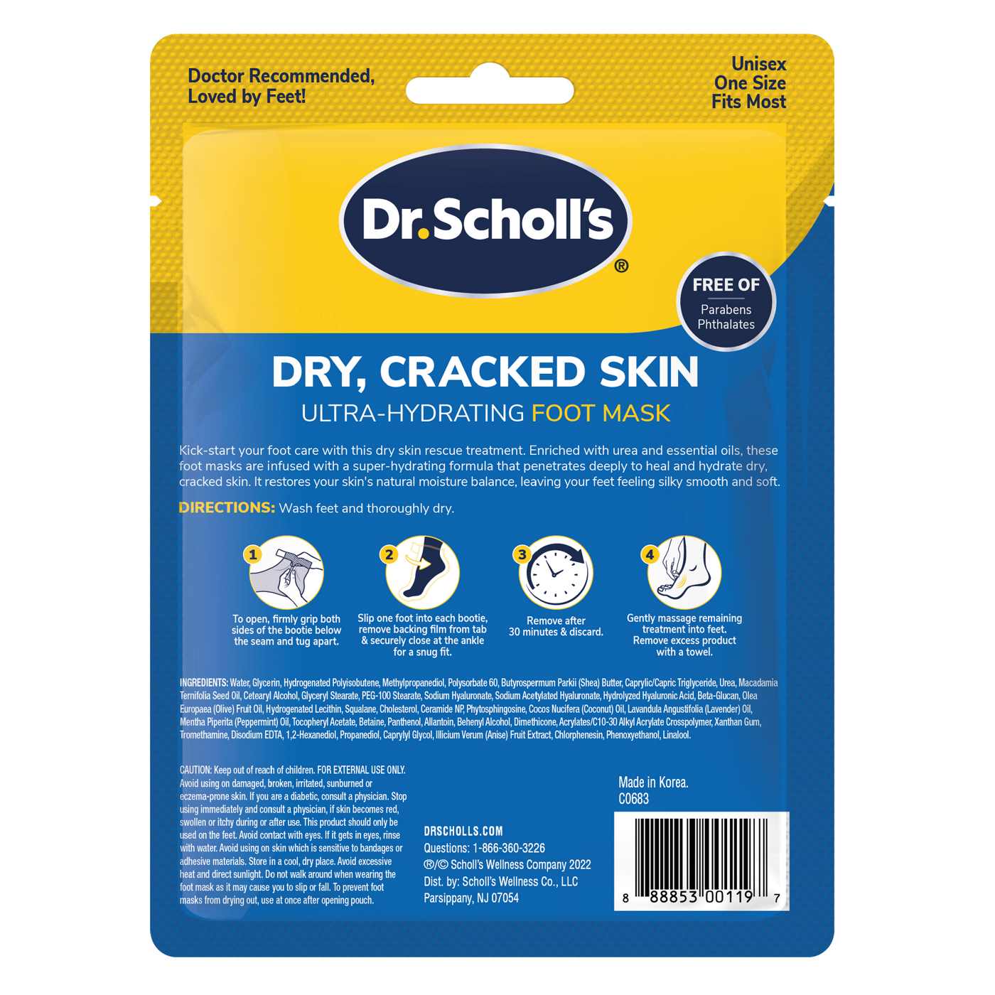 Dr. Scholl's Ultra Hydrating Foot mask intensely moisturizes, repairs and softens dry, cracked heels and feet. Specially formulated with a blend of urea, humectants and essential oils that leave skin feeling deeply hydrated, silky smooth and soft.