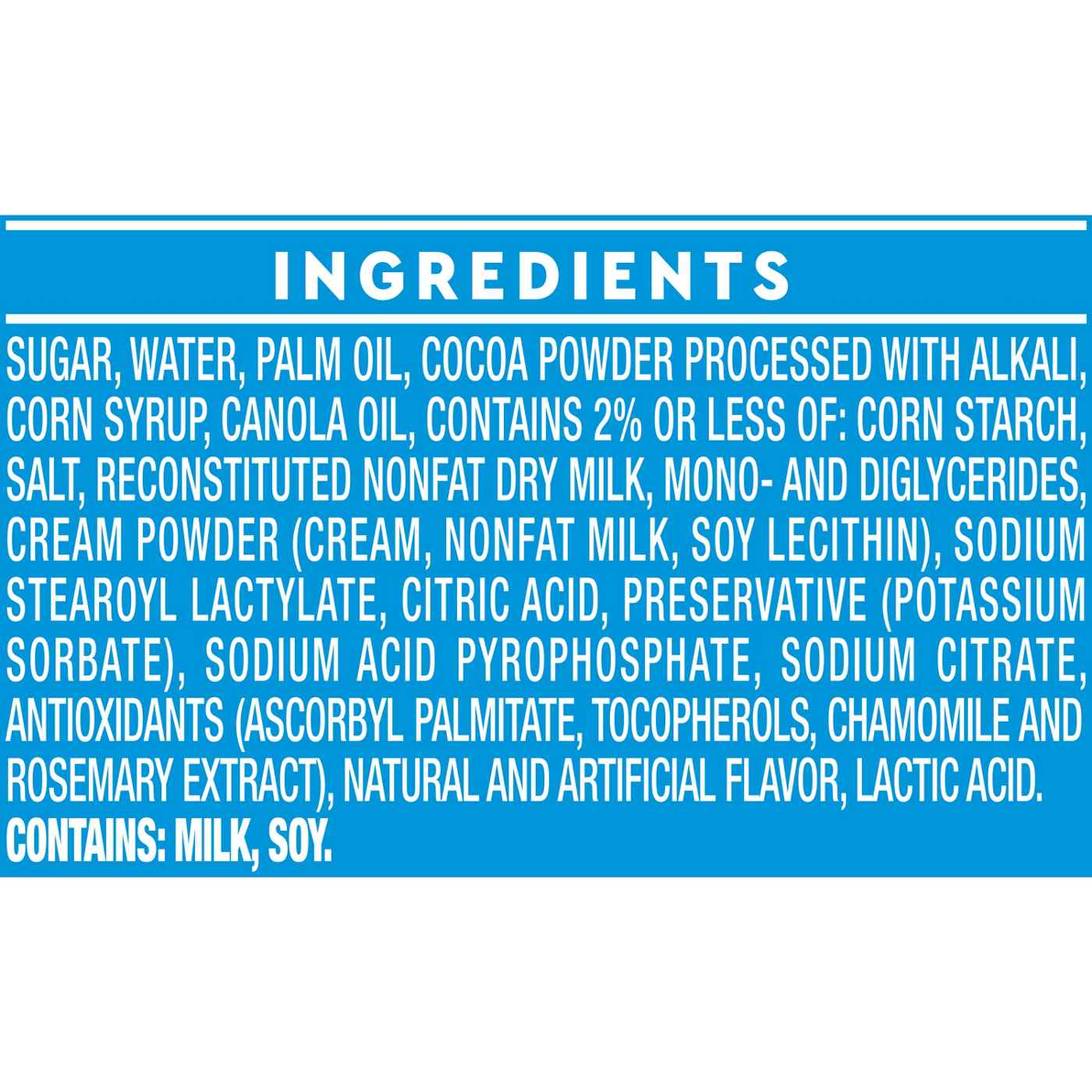 Sugar, Water, Palm Oil, Cocoa Powder Processed with Alkali, Corn Syrup, Canola Oil, Contains 2% or Less of: Corn Starch, Salt, Reconstituted Nonfat Dry Milk, Mono- and Diglycerides, Cream Powder (Cream, Nonfat Milk, Soy Lecithin), Sodium Stearoyl Lactylate, Citric Acid, Preservative (Potassium Sorbate), Sodium Acid Pyrophosphate, Sodium Citrate, Antioxidants (Ascorbyl Palmitate, Tocopherols, Chamomile and Rosemary Extract), Natural and Artificial Flavor, Lactic Acid.