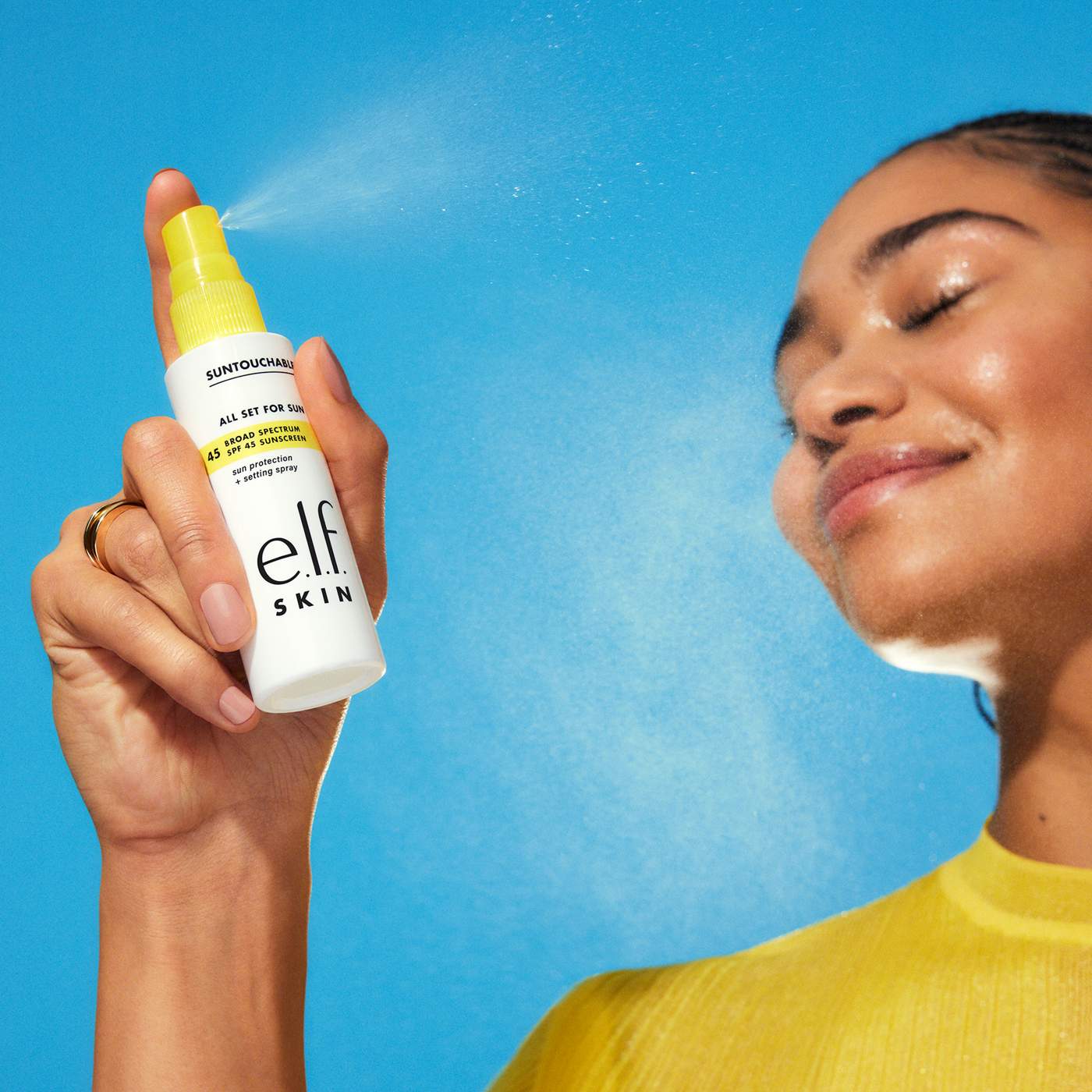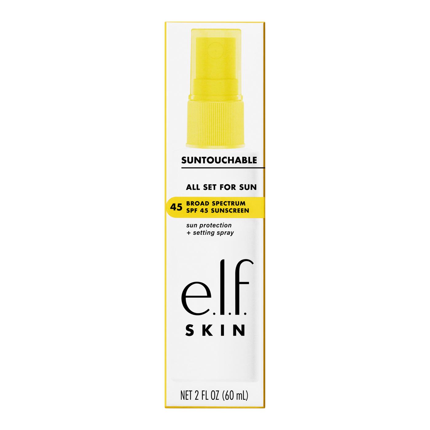 Help protect your skin and set your makeup with e.l.f. SKIN’s Suntouchable All Set For Sun SPF 45. This overachieving clear SPF setting spray has a weightless formula that delivers clear broad-spectrum SPF 45 protection and leaves zero white cast on all skin tones. Infused with watermelon fruit extract and prickly pear seed oil, the quick-dry, skin-loving mist allows for easy re-application to refresh both your look while providing sun protection throughout the day. Spritz setting spray after applying your makeup to help protect your skin and your look.Why You’ll Love It:• Clear setting spray with broad spectrum SPF 45 sunscreen• Primes, protects, refreshes, and sets makeup in place for long-lasting wear• Allows for easy SPF re-application over makeup throughout the day• Quick-dry spray formula that won’t leave a white cast or a greasy feel• Infused with skin-loving ingredients like watermelon fruit extract, prickly pear seed oil, and bisabolol• Clear formula great for all skin tones• Fragrance-freeKey Ingredients:• Watermelon fruit extract• Prickly pear seed oil• BisabololGreat for: Dry, Oily, and Combination SkinAll e.l.f. products are free from phthalates, parabens, nonylphenol ethoxylates, triclosan, triclocarban, and hydroquinone. All e.l.f. SKIN is also free from sulfates.e.l.f. is proud to partner with Fair Trade USA™ and manufacture products in Fair Trade Certified™ facilities. Look for the Fair Trade Certified™ seal on your e.l.f. product!e.l.f. stands with every eye, lip, face, paw and fin. Proudly vegan, cruelty-free and Leaping Bunny Certified.