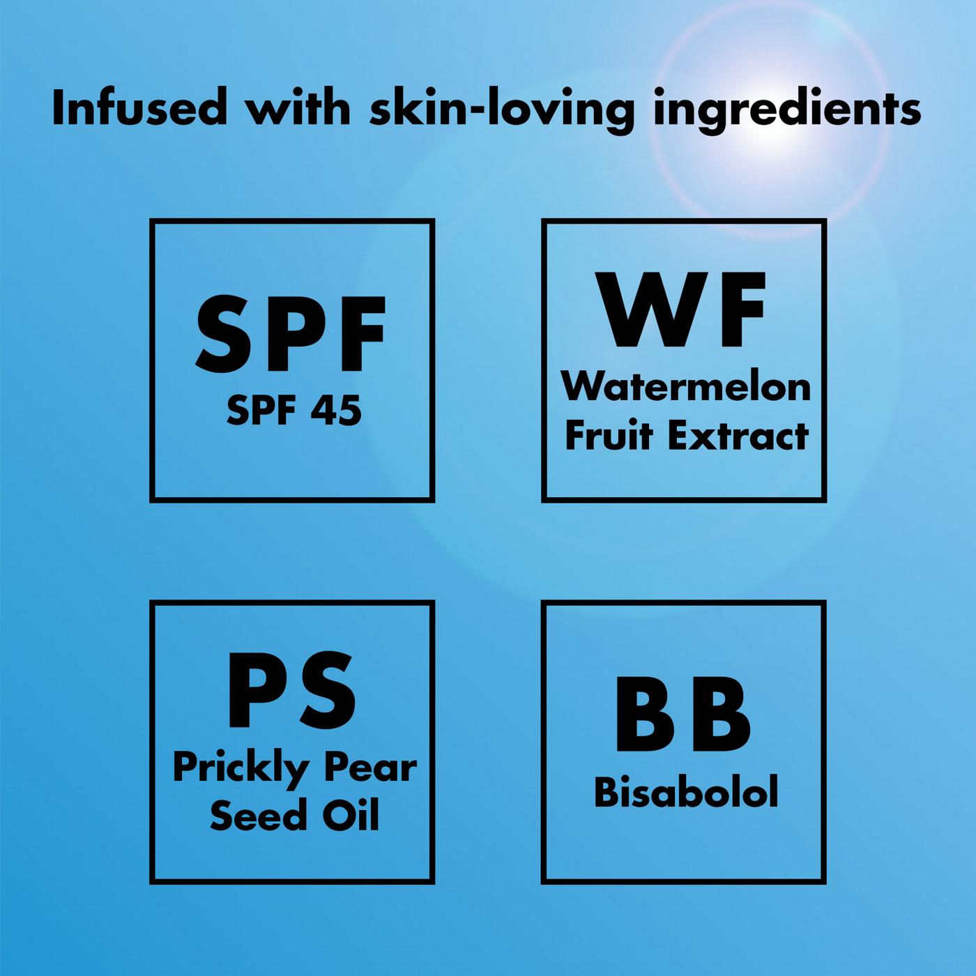 Active Ingredients: Avobenzone – 2.9% Octisalate – 4.9% Octocrylene – 9.5% Inactive Ingredients: Alcohol Denat., Butyloctyl Salicylate, Isododecane, Diisooctyl Succinate, Diheptyl Succinate, Silica Caprylyl Silylate, Dicaprylyl Carbonate, Helianthus Annuus (Sunflower) Seed Oil, Citrullus Lanatus (Watermelon) Fruit Extract, Opuntia Ficus-Indica Seed Oil, Bisabolol, PVP, Capryloyl Glycerin/Sebacic Acid Copolymer, Ethyl Ferulate, Tocopherol, Beta-Sitosterol, Squalene, Nylon-12, Lauroyl LysineAllergens and safety warnings