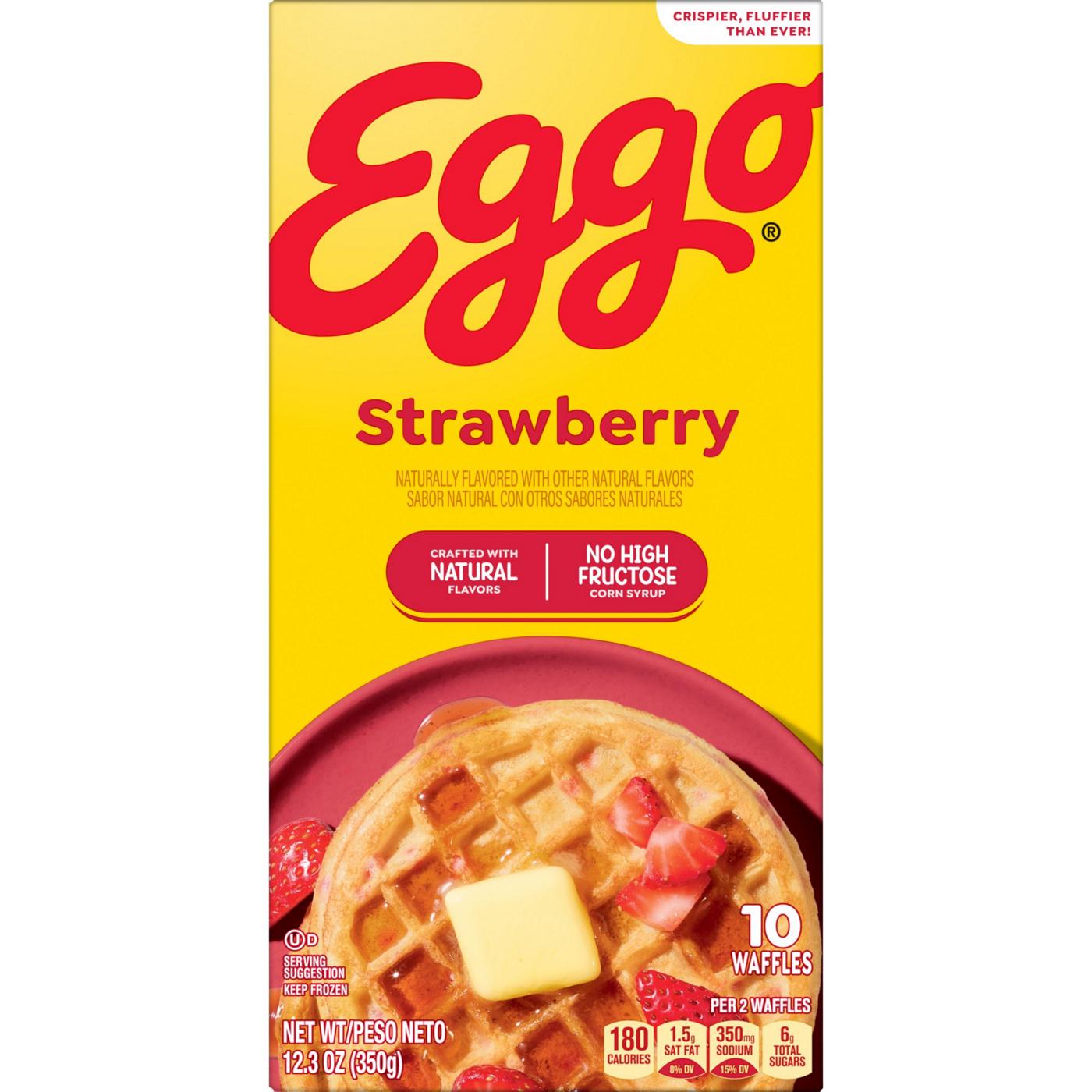 Rise and shine to a classic waffle your family knows and loves. Eggo Strawberry waffles are crispy on the outside and fluffy on the inside for a comforting taste and delightful texture. Crafted with natural flavors and made with no high fructose corn syrup, these waffles deliver the sweet flavor of strawberries in every bite. Whether it’s a busy weekday or a slow weekend morning, these waffles couldn’t be easier to enjoy. Simply heat in the toaster for a warm, crisp bite, or bake a batch in the oven - either way, you’ll love the sweet, homemade aroma fans have enjoyed for generations. Two waffles provide a good source of 9 vitamins and minerals, so you can feel good about serving them to your family. Baked in the USA, Eggo waffles help bring warmth, comfort, and smiles to any breakfast table. Top them with butter and syrup, fresh fruit, jam, whipped cream, or powdered sugar. No matter how you enjoy them, every bite is an “mmmmm” moment. They’re just so delicious - why would you L’Eggo your Eggo?