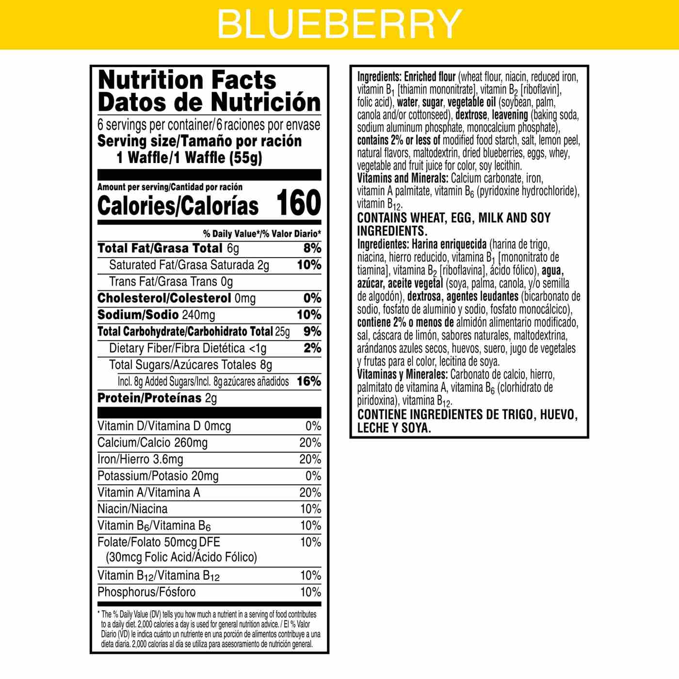 Enriched Flour (Wheat Flour, Niacin, Reduced Iron, Vitamin B1 [Thiamin Mononitrate], Vitamin B2 [Riboflavin], Folic Acid), Water, Sugar, Vegetable Oil (Soybean, Palm, Canola And/Or Cottonseed), Dextrose, Leavening (Baking Soda, Sodium Aluminum Phosphate, Monocalcium Phosphate), Contains 2% Or Less Of Modified Food Starch, Salt, Lemon Peel, Natural Flavors, Maltodextrin, Dried Blueberries, Eggs, Whey, Vegetable And Fruit Juice For Color, Soy Lecithin. Vitamins And Minerals: Calcium Carbonate, Iron, Vitamin A Palmitate, Vitamin B6 (Pyridoxine Hydrochloride), Vitamin B12.