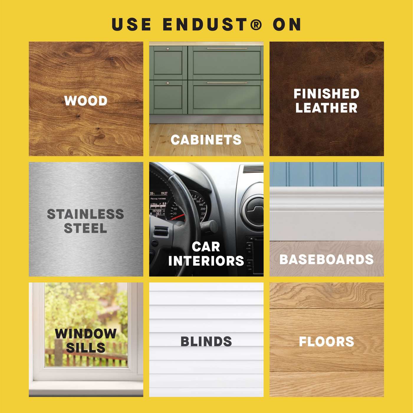 Endust fast acting formula picks-up and holds dust while providing superior cleaning. It even removes crayon and grease marks! Provides an even, consistent shine without buffing. No-wax formula leaves no waxy residue build-up. Refreshing lemon fragrance. Multi-surface convenience. Endust unique formula with no wax works just about anywhere dust collects, including non-wood surfaces. All furniture. Cabinets and counters. paneling and window sills. Floors. Non-fabric blinds. Dashboards. No CFCs.