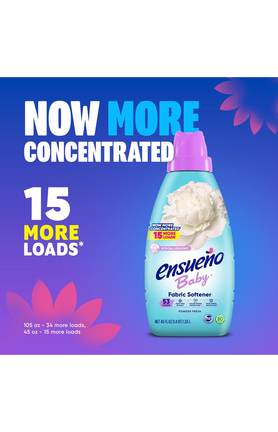 Get the powerful softness of Ensueño with the new, concentrated formula that packs six extra loads* in every 45 oz bottle. Now, a smaller pour gives your family the same confidence of long-lasting aroma and comforting softness in every wash. Add the extra touch of softness to your laundry experience with Ensueño Baby Fabric Softener, a hero for caring parents. Ensueño Baby Fabric Softener combines a soft baby powder scent and a touch of aloe vera that lasts for weeks after washing. We add natural ingredients to create a gentle formula for sensitive skin. Use Ensueño for a hypoallergenic formula that is safe and freshly fragrant.