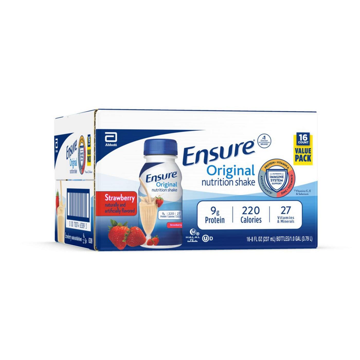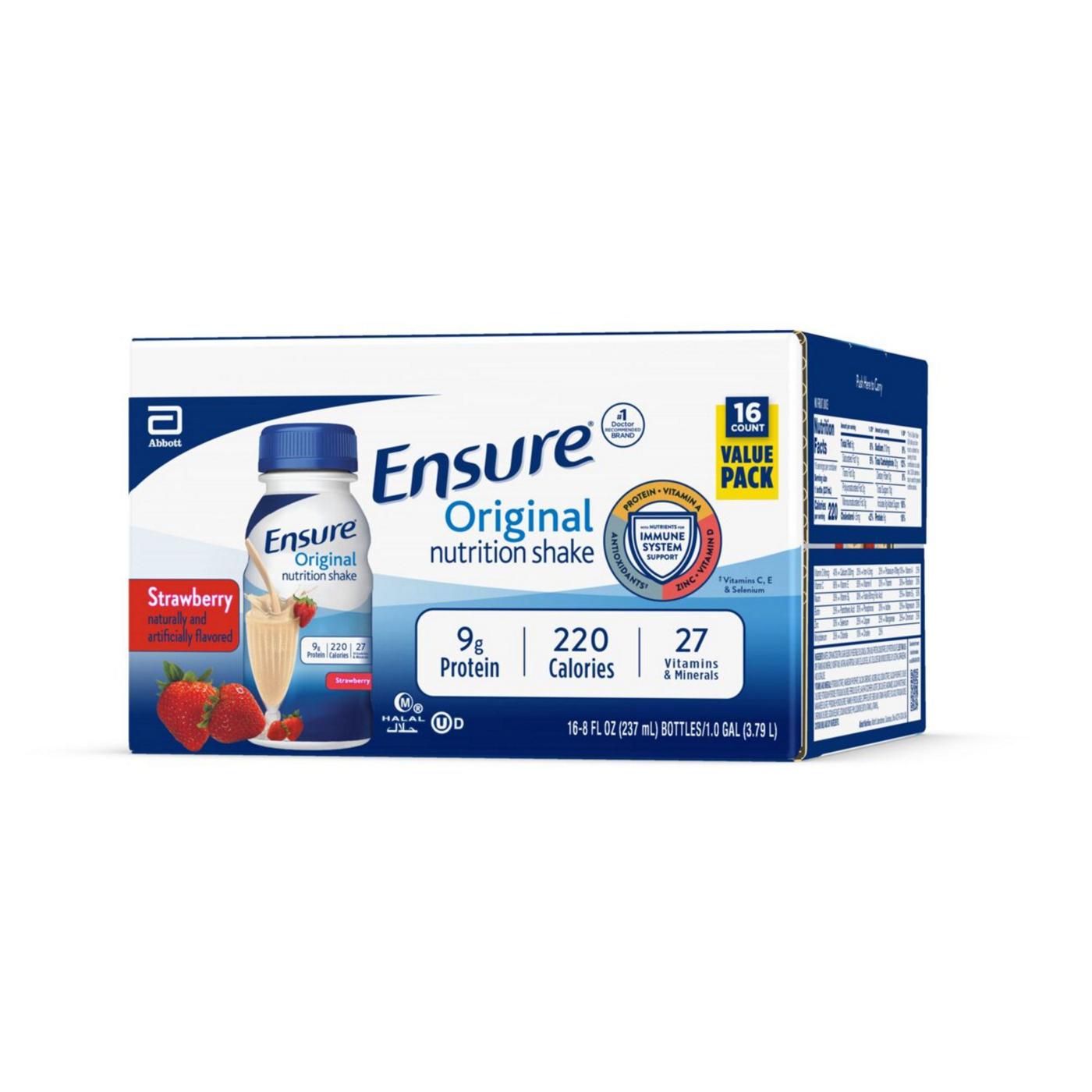 Ensure Original nutrition shakes have 9 grams of protein and 27 vitamins and minerals. Ensure nutritional shakes support immune health by supplying protein, vitamins A and D, zinc, and vitamins C and E. These shakes are kosher, halal, and suitable for lactose intolerance.