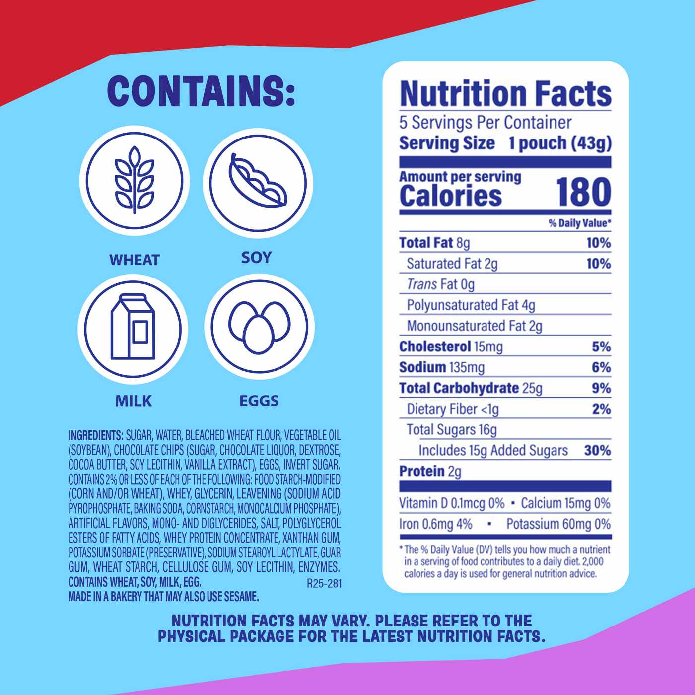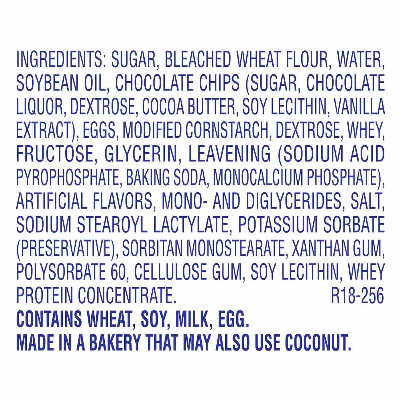 Sugar, Water, Bleached Wheat Flour, Vegetable Oil (Soybean), Chocolate Chips [Sugar, Chocolate Liquor, Dextrose, Cocoa Butter, Soy Lecithin, Vanilla Extract], Eggs, Invert Sugar, Contains 2% Or Less Of Each Of The Following: [Food Starch-Modified (Corn And/Or Wheat), Whey, Glycerin, Leavening [Sodium Acid Pyrophosphate, Baking Soda, Cornstarch, Monocalcium Phosphate], Artificial Flavors, Mono- And Diglycerides, Salt, Polyglycerol Esters Of Fatty Acids, Whey Protein Concentrate, Xanthan Gum, Potassium Sorbate (Preservative), Sodium Stearoyl Lactylate, Guar Gum, Wheat Starch, Cellulose Gum, Soy Lecithin, Enzymes].Allergens and safety warnings