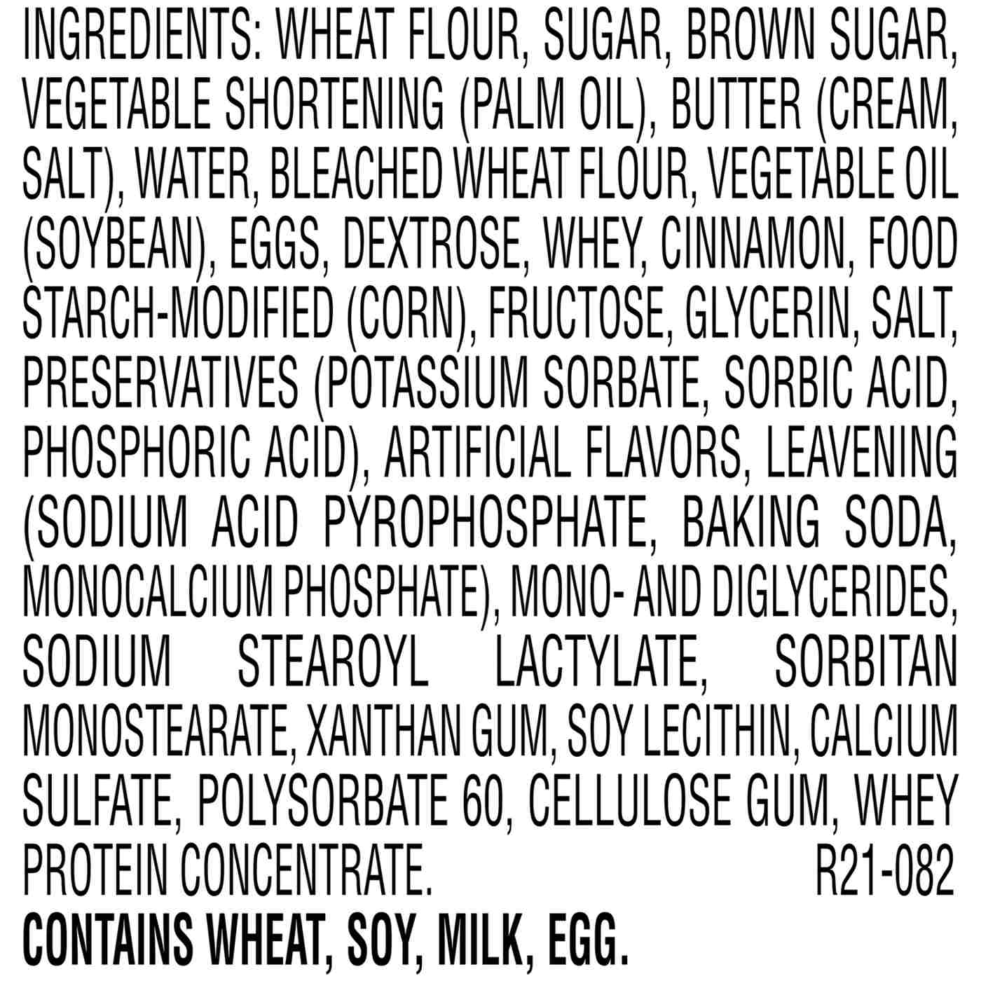 Wheat Flour, Sugar, Brown Sugar, Vegetable Shortening (Palm Oil), Butter [Cream, Salt], Water, Bleached Wheat Flour, Vegetable Oil (Soybean), Eggs, Contains 2% Or Less Of Each Of The Following: [Invert Sugar, Whey, Cinnamon, Food Starch-Modified (Corn And/Or Wheat), Glycerin, Artificial Flavors, Salt, Preservatives [Potassium Sorbate, Sorbic Acid, Phosphoric Acid], Leavening [Sodium Acid Pyrophosphate, Baking Soda, Monocalcium Phosphate], Mono- And Diglycerides, Xanthan Gum, Sorbitan Monostearate, Gums [Guar, Cellulose], Sodium Stearoyl Lactylate, Soy Lecithin, Whey Protein Concentrate, Polysorbate 60, Enzymes].Allergens and safety warnings