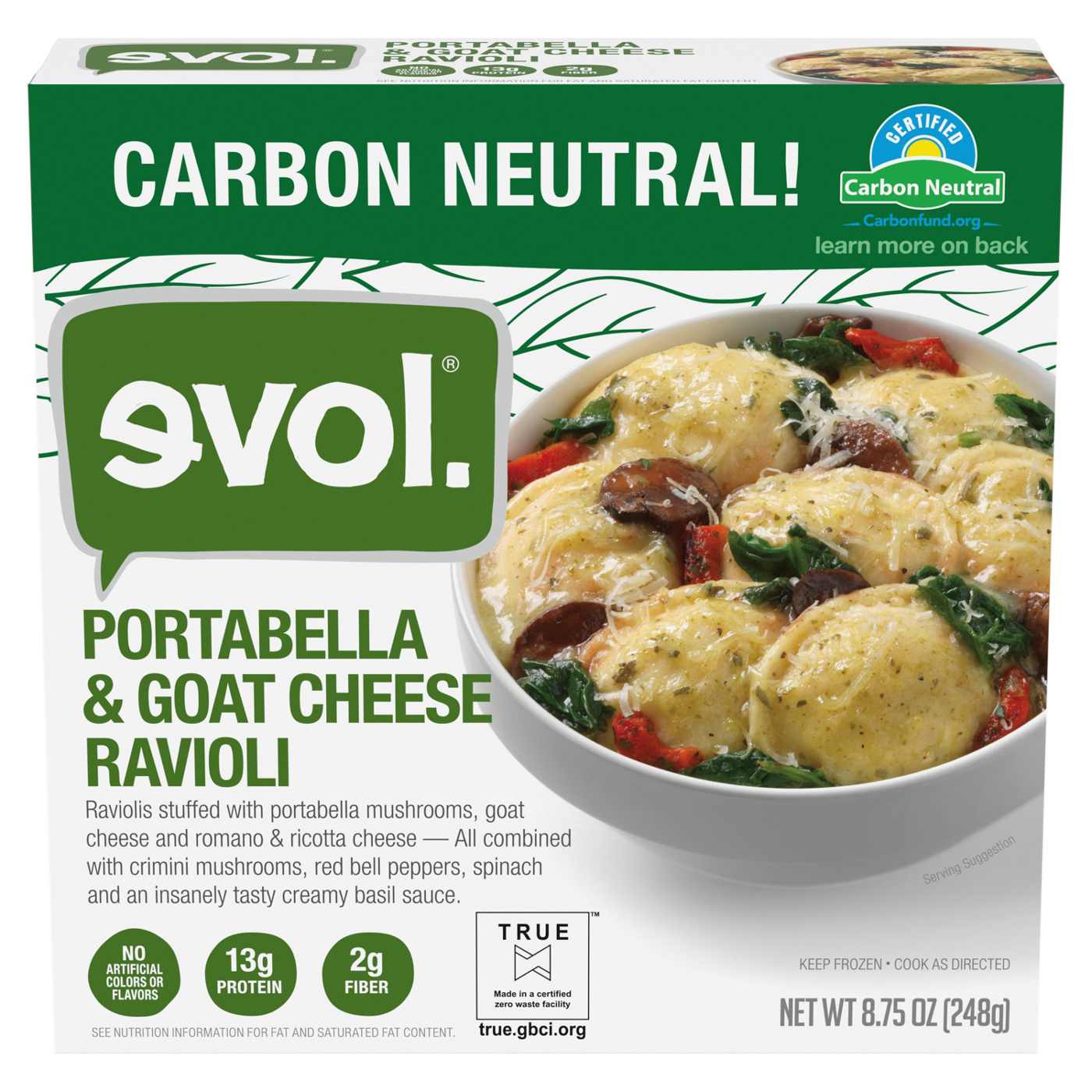 Evol Portabella & Goat Cheese Ravioli is a flavorful spin on a favorite dish. Made with ravioli stuffed with portabella mushrooms, goat cheese, Romano and ricotta cheeses, combined with crimini mushrooms, red bell peppers, spinach and a creamy basil sauce, this microwaveable meal is ready in minutes. It contains 13 grams of protein and 2 grams of fiber per serving.