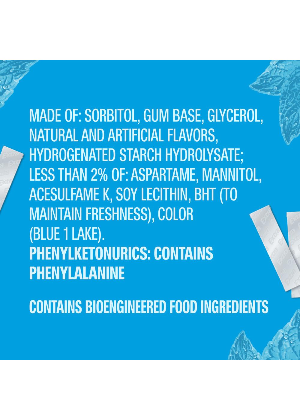 Sorbitol, Gum Base, Glycerol, Natural And Artificial Flavors, Hydrogenated Starch Hydrolysate; Less Than 2% Of: Aspartame, Mannitol, Acesulfame K, Soy Lecithin, Bht (To Maintain Freshness), Color (Blue 1 Lake).Allergens and safety warnings