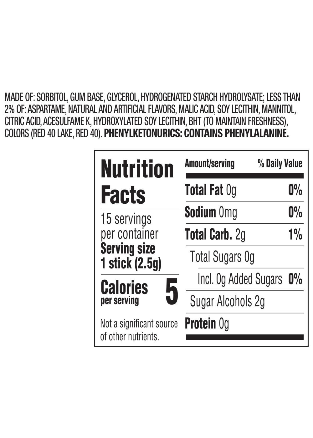 Sorbitol, Gum Base, Glycerol, Hydrogenated Starch Hydrolysate, Less Than 2% Of: Aspartame, Natural And Artificial Flavors, Malic Acid, Soy Lecithin, Mannitol, Citric Acid, Acesulfame K, Hydroxylated Soy Lecithin, Bht (To Maintain Freshness), Colors (Red 40 Lake, Red 40).