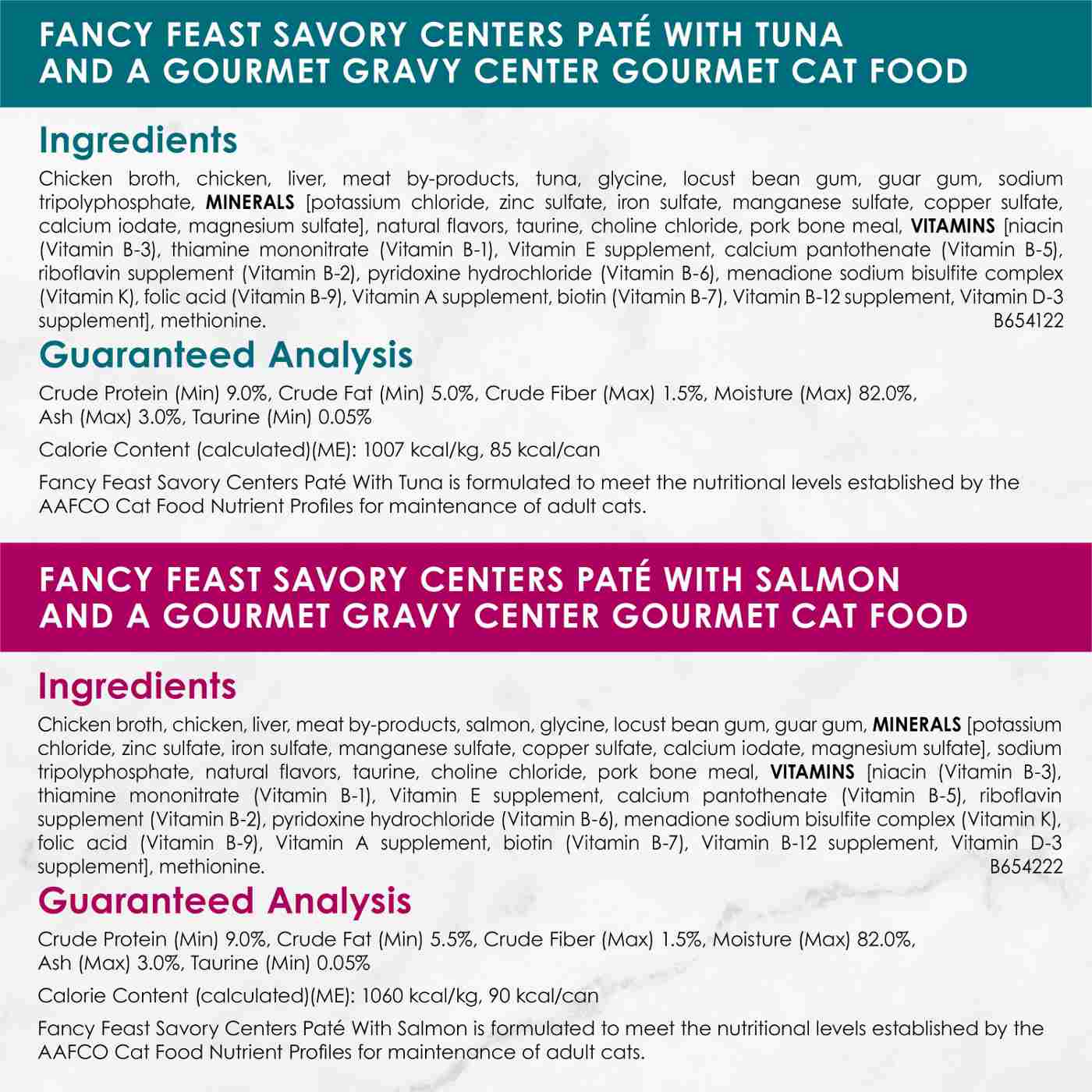 Savory Centers Paté With Chicken: Chicken Broth, Chicken, Liver, Meat By-Products, Fish, Glycine, Locust Bean Gum, Guar Gum, Sodium Tripolyphosphate, Minerals [Potassium Chloride, Zinc Sulfate, Iron Sulfate, Manganese Sulfate, Copper Sulfate, Calcium Iodate, Magnesium Sulfate], Natural Flavors, Pork Bone Meal, Taurine, Choline Chloride, Vitamins [Niacin (Vitamin B-3), Thiamine Mononitrate (Vitamin B-1), Vitamin E Supplement, Calcium Pantothenate (Vitamin B-5), Riboflavin Supplement (Vitamin B-2), Pyridoxine Hydrochloride (Vitamin B-6), Menadione Sodium Bisulfite Complex (Vitamin K), Folic Acid (Vitamin B-9), Vitamin A Supplement, Biotin (Vitamin B-7), Vitamin B-12 Supplement, Vitamin D-3 Supplement], Methionine. B654322 Savory Centers Paté With Salmon: Chicken Broth, Chicken, Liver, Meat By-Products, Salmon, Glycine, Locust Bean Gum, Guar Gum, Minerals [Potassium Chloride, Zinc Sulfate, Iron Sulfate, Manganese Sulfate, Copper Sulfate, Calcium Iodate, Magnesium Sulfate], Sodium Tripolyphosphate, Natural Flavors, Taurine, Choline Chloride, Pork Bone Meal, Vitamins [Niacin (Vitamin B-3), Thiamine Mononitrate (Vitamin B-1), Vitamin E Supplement, Calcium Pantothenate (Vitamin B-5), Riboflavin Supplement (Vitamin B-2), Pyridoxine Hydrochloride (Vitamin B-6), Menadione Sodium Bisulfite Complex (Vitamin K), Folic Acid (Vitamin B-9), Vitamin A Supplement, Biotin (Vitamin B-7), Vitamin B-12 Supplement, Vitamin D-3 Supplement], Methionine. B654222 Savory Centers Paté With Tuna: Chicken Broth, Chicken, Liver, Meat By-Products, Tuna, Glycine, Locust Bean Gum, Guar Gum, Sodium Tripolyphosphate, Minerals [Potassium Chloride, Zinc Sulfate, Iron Sulfate, Manganese Sulfate, Copper Sulfate, Calcium Iodate, Magnesium Sulfate], Natural Flavors, Taurine, Choline Chloride, Pork Bone Meal, Vitamins [Niacin (Vitamin B-3), Thiamine Mononitrate (Vitamin B-1), Vitamin E Supplement, Calcium Pantothenate (Vitamin B-5), Riboflavin Supplement (Vitamin B-2), Pyridoxine Hydrochloride (Vitamin B-6), Menadione Sodium Bisulfite Complex (Vitamin K), Folic Acid (Vitamin B-9), Vitamin A Supplement, Biotin (Vitamin B-7), Vitamin B-12 Supplement, Vitamin D-3 Supplement], Methionine. B654122 Savory Centers Paté With Beef: Chicken Broth, Chicken, Liver, Meat By-Products, Fish, Glycine, Beef, Locust Bean Gum, Guar Gum, Minerals [Potassium Chloride, Zinc Sulfate, Iron Sulfate, Manganese Sulfate, Copper Sulfate, Calcium Iodate, Magnesium Sulfate], Sodium Tripolyphosphate, Natural Flavors, Taurine, Choline Chloride, Pork Bone Meal, Vitamins [Niacin (Vitamin B-3), Thiamine Mononitrate (Vitamin B-1), Vitamin E Supplement, Calcium Pantothenate (Vitamin B-5), Riboflavin Supplement (Vitamin B-2), Pyridoxine Hydrochloride (Vitamin B-6), Menadione Sodium Bisulfite Complex (Vitamin K), Folic Acid (Vitamin B-9), Vitamin A Supplement, Biotin (Vitamin B-7), Vitamin B-12 Supplement, Vitamin D-3 Supplement], Methionine. B654022Allergens and safety warnings