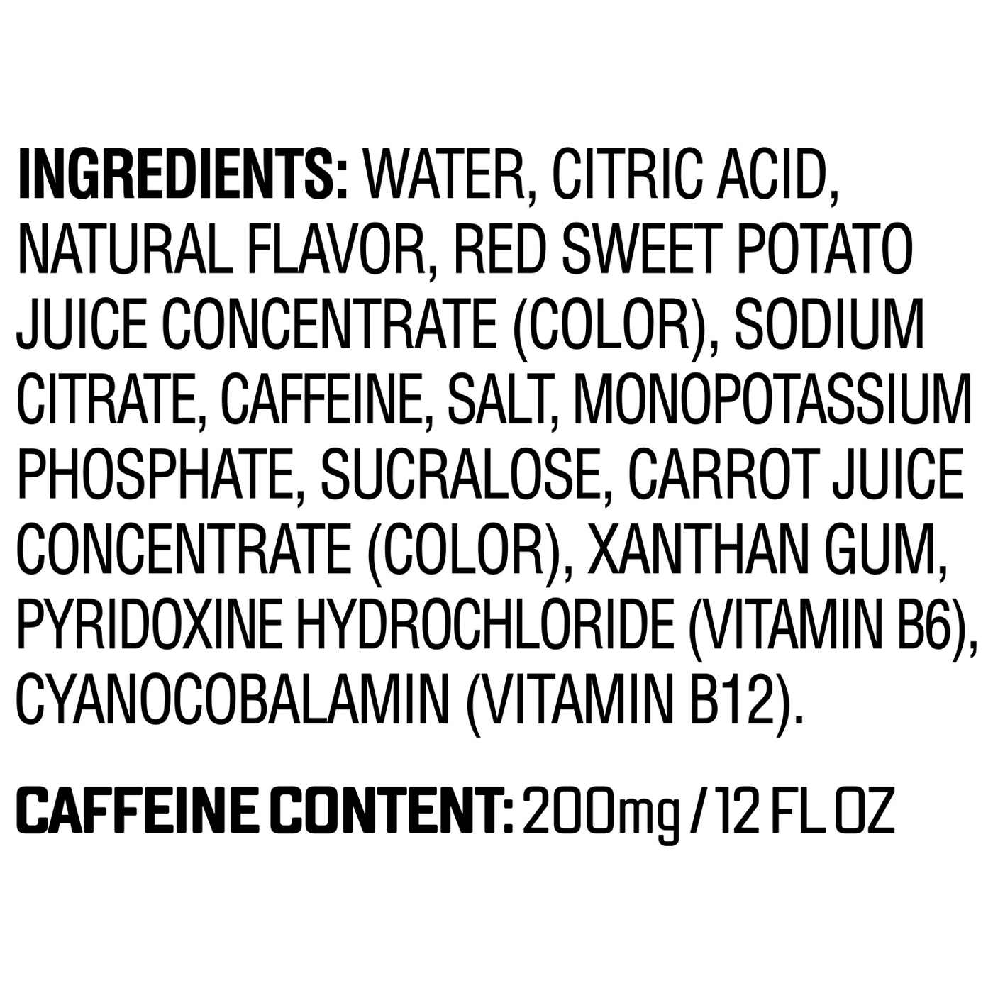 Water, Citric Acid, Natural Flavor, Red Sweet Potato Juice Concentrate (Color), Sodium Citrate, Caffeine, Salt, Monopotassium Phosphate, Sucralose, Carrot Juice Concentrate (Color), Xanthan Gum, Pyridoxine Hydrochloride (Vitamin B6), Cyanocobalamin (Vitamin B12).Allergens and safety warnings