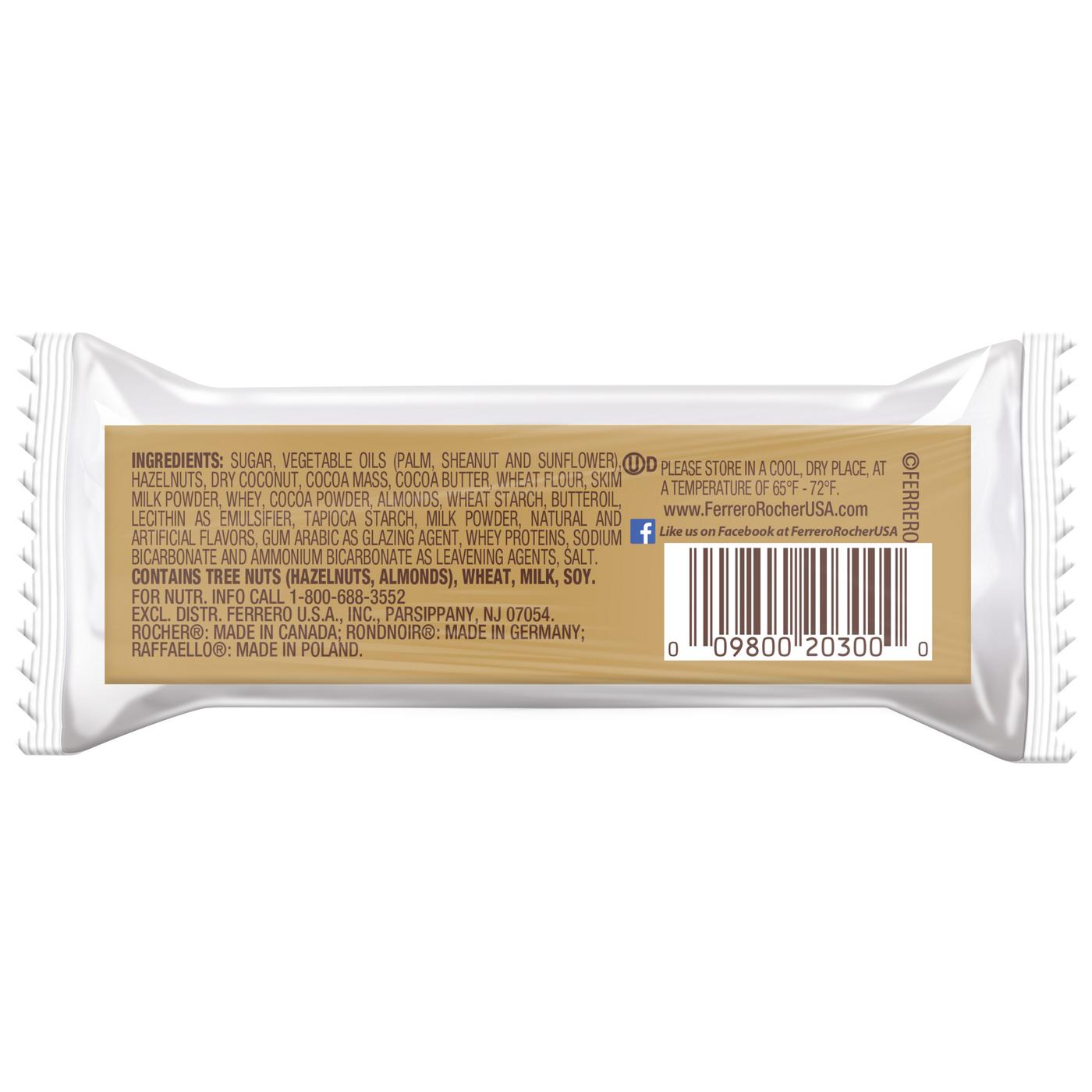 rocher:milk chocolate (sugar, cocoa butter, cocoa mass, skim milk powder, butteroil, lecithin as emulsifier (soy), vanillin: an artificial flavor), hazelnuts,sugar,palm oil,wheat flour,whey (milk),lowfat cocoa powder,lecithin as emulsifier (soy),sodium bicarbonate as leavening agent, salt,vanillin: an artificial flavor.raffaello:dry coconut,vegetable oils (palm and sheanut),sugar,almonds,skim milk powder,whey powder (milk),wheat flour,tapioca starch,lecithin as emulsifier (soy),natural and artificial flavors,sodium bicarbonate as leavening agent,salt.rondnoir:semisweet chocolate (sugar, cocoa mass, cocoa butter, lecithin as emulsifier (soy), vanillin: an artificial flavor), sugar,vegetable oils (palm and sunflower),wheat flour,cocoa powder,whey powder (milk),skim milk powder,milk chocolate (sugar, cocoa butter, milk powder, cocoa mass, lecithin as emulsifier (soy), vanillin: an artificial flavor), wheat starch, cocoa butter,lecithin as emulsifier (soy),gum arabic as glazing agent,whey proteins (milk),cocoa mass,sodium bicarbonate and ammonium bicarbonate as leavening agents, salt,vanillin: an artificial flavor.Allergens and safety warnings