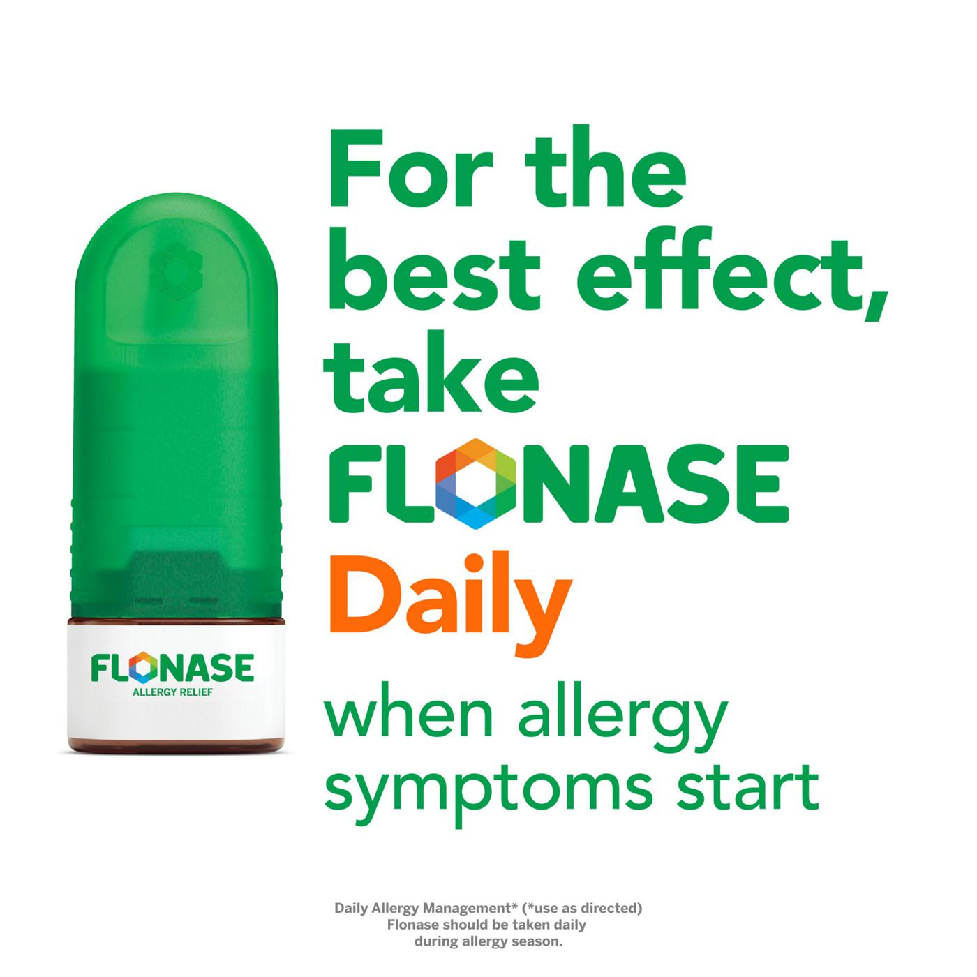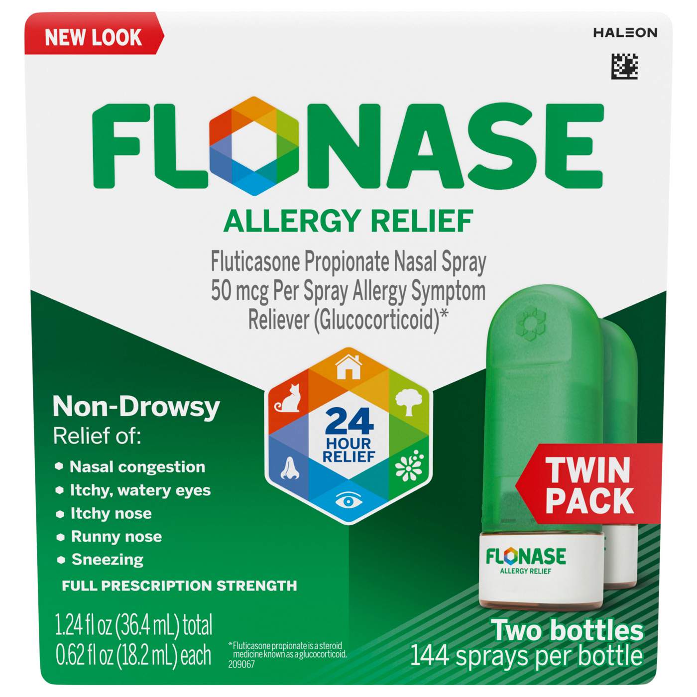 Flonase Allergy Relief Nasal Spray relieves nasal congestion, runny nose, sneezing, itchy nose, and itchy, watery eyes caused by allergens such as pollen, mold, dust, and pet dander. Its non-drowsy, 24-hour formula is perfect for combating seasonal allergies. Whether it's Spring, back-to-school, or Fall, Flonase nasal spray is your trusted solution for year-round allergy relief, recognized as the number 1 doctor recommended brand of allergy medicine (1). By blocking 6 allergic substances (2), Flonase prevents your body from overreacting to allergens. For optimal results, use daily. Simply shake gently, prime the bottle, and administer up to two sprays per nostril (for adults, children 4-11 use 1 spray per nostril per day). Safe for adults and children 4 years and older. Now available in a new recyclable paper package that's easier to open—no scissors needed!(1) Among OTC Allergy Medications based on most recent physicians' survey dated 06/02/2023(2) Flonase acts on multiple inflammatory substances (histamine, prostaglandins, cytokines, tryptases, chemokines, and leukotrienes). The exact number of mediators and precise mechanisms are unknown• Two 144-spray bottles of Flonase Allergy Relief Nasal Spray• Great for seasonal allergy relief in Spring, back-to-school, and Fall, or for year-round use• Same Flonase relief now in a new recyclable paper package that's easier to open—no scissors needed• Non-drowsy long lasting 24 hour relief of indoor and outdoor allergy symptoms caused by allergens including pollen, mold, dust mites and pet dander• Flonase is safe to use every day (consult with a doctor after 6 months). Each 144ct bottle provides up to 10 weeks (72 days) supply when used one spray per nostril, every day. Use daily for best results• Number 1 doctor recommended allergy brand (1) delivers full prescription strength relief from allergies• HSA and FSA eligible product