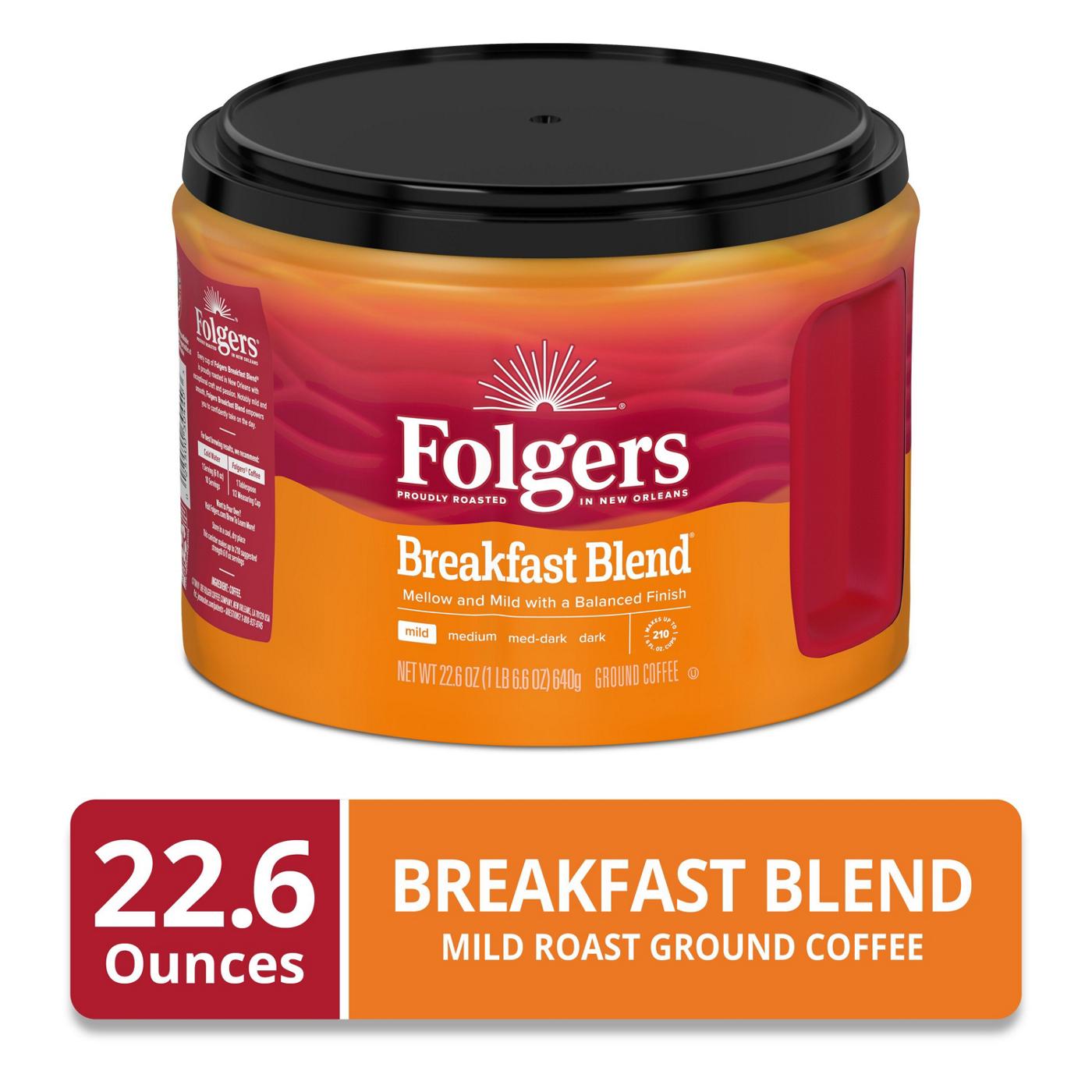 Folgers Breakfast Blend coffee packs irresistible taste in every cup. From the very first sip of this smooth mild roast coffee, you’re greeted by mellow flavor with a balanced finish. But it’s not just quality coffee you’re tasting — it’s the exceptional craft and passion behind every batch, proudly roasted in New Orleans by our talented team. So, go ahead and brew it up. Our ground coffee is ready to prep with any method you throw at it, from pour over to automatic drip. Enjoy it by the cup or share a pot with your crew — in the morning or all day long.Contains one (1) 22.6-oz. canister of Folgers Breakfast Blend ground coffeeMellow and mild light roast coffeeSmooth flavor with a balanced finishReady to brew with your preferred methodProudly roasted in New OrleansExpertly roasted to make the most out of every bean — resulting in coffee grounds that weigh less by volume but deliver the same taste you love across the same number of brewed cups
