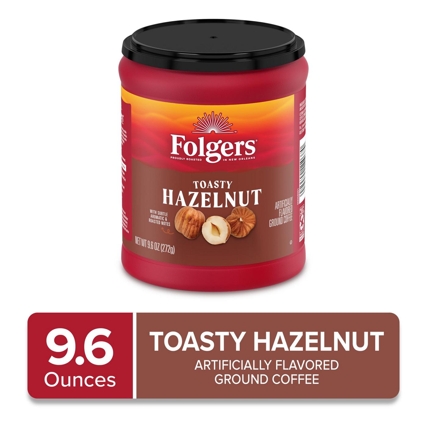 Enjoy the roasted notes of Folgers Toasty Hazelnut artificially flavored ground coffee. Deliciously distinct and subtly sweet, this ground coffee delivers aromatic flavor that will delight your taste buds every time. But that’s no surprise — every cup of Folgers Coffee is roasted specially in New Orleans with exceptional craft and passion, ensuring that you have plenty to love in every cup. So, brew yourself a mug or a pot using your favorite method. Then, customize it with your favorite creamer or sweetener, or drink it as is for incredible taste that’s sure to elevate any part of your day. Order yours and enjoy.Contains one (1) 9.6 oz. canister of Folgers Toasty Hazelnut artificially flavored coffeeDeliciously distinct and subtly sweet with roasted notesAromatic flavor that will delight your taste buds every timeEasy to prepare with virtually any coffee makerEvery cup of Folgers Coffee is roasted specially in New Orleans with exceptional craft and passion