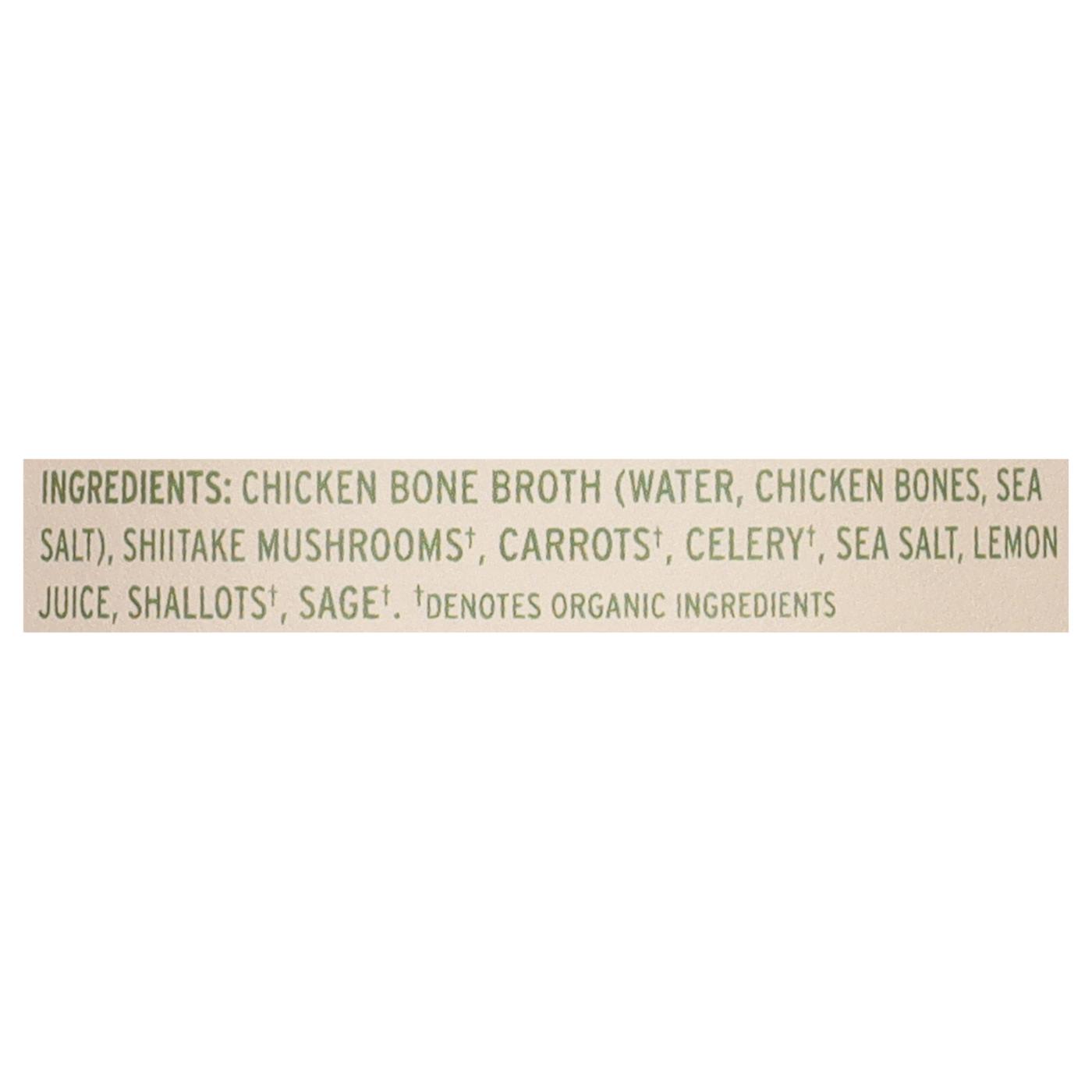Chicken Bone Broth (Water, Chicken Bones, Sea Salt), Shiitake Mushrooms (a), Carrots (a), Celery (a), Sea Salt, Lemon Juice, Shallots (a), Sage (a). (a) Denotes Organic Ingredients.Allergens and safety warnings