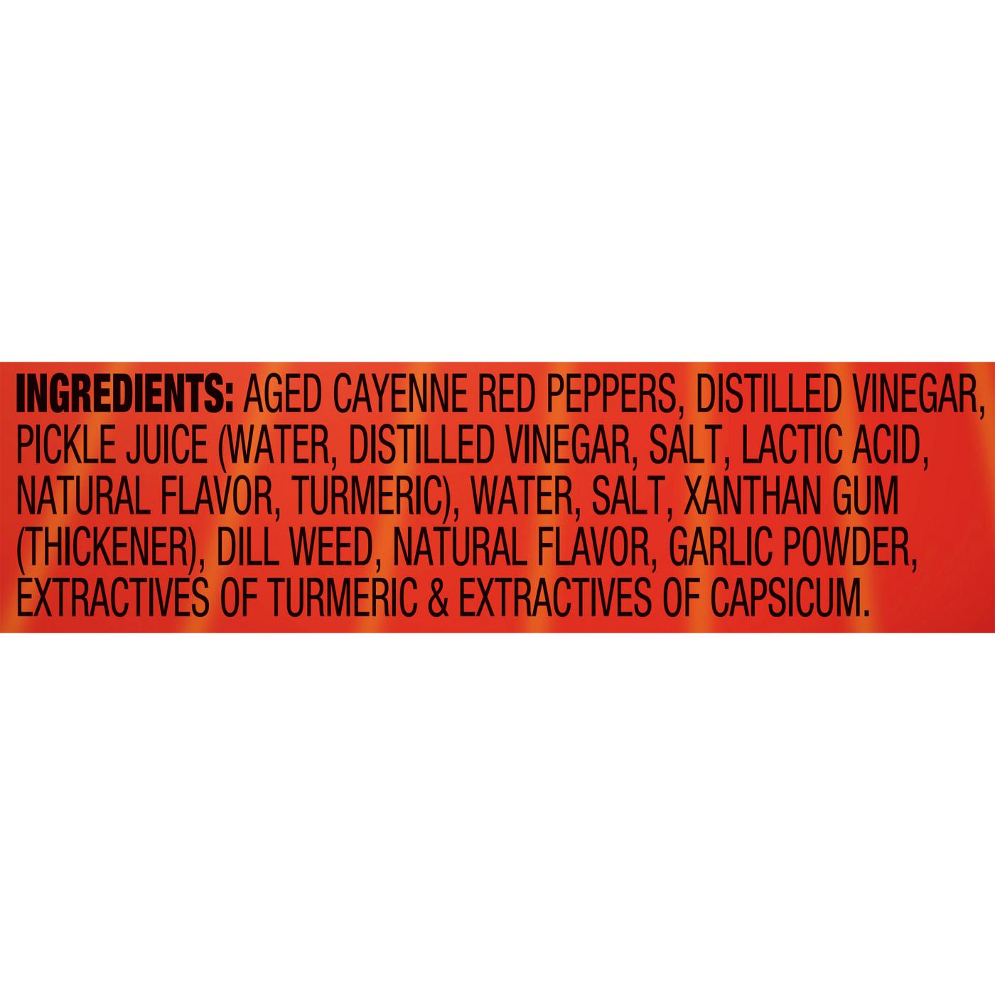 Aged Cayenne Red Peppers, Distilled Vinegar, Pickle Juice (Water, Distilled Vinegar, Salt, Lactic Acid, Natural Flavor, Turmeric), Water, Salt, Xanthan Gum (Thickener), Dill Weed, Natural Flavor, Garlic Powder, Extractives Of Turmeric & Extractives Of CapsicumAllergens and safety warnings