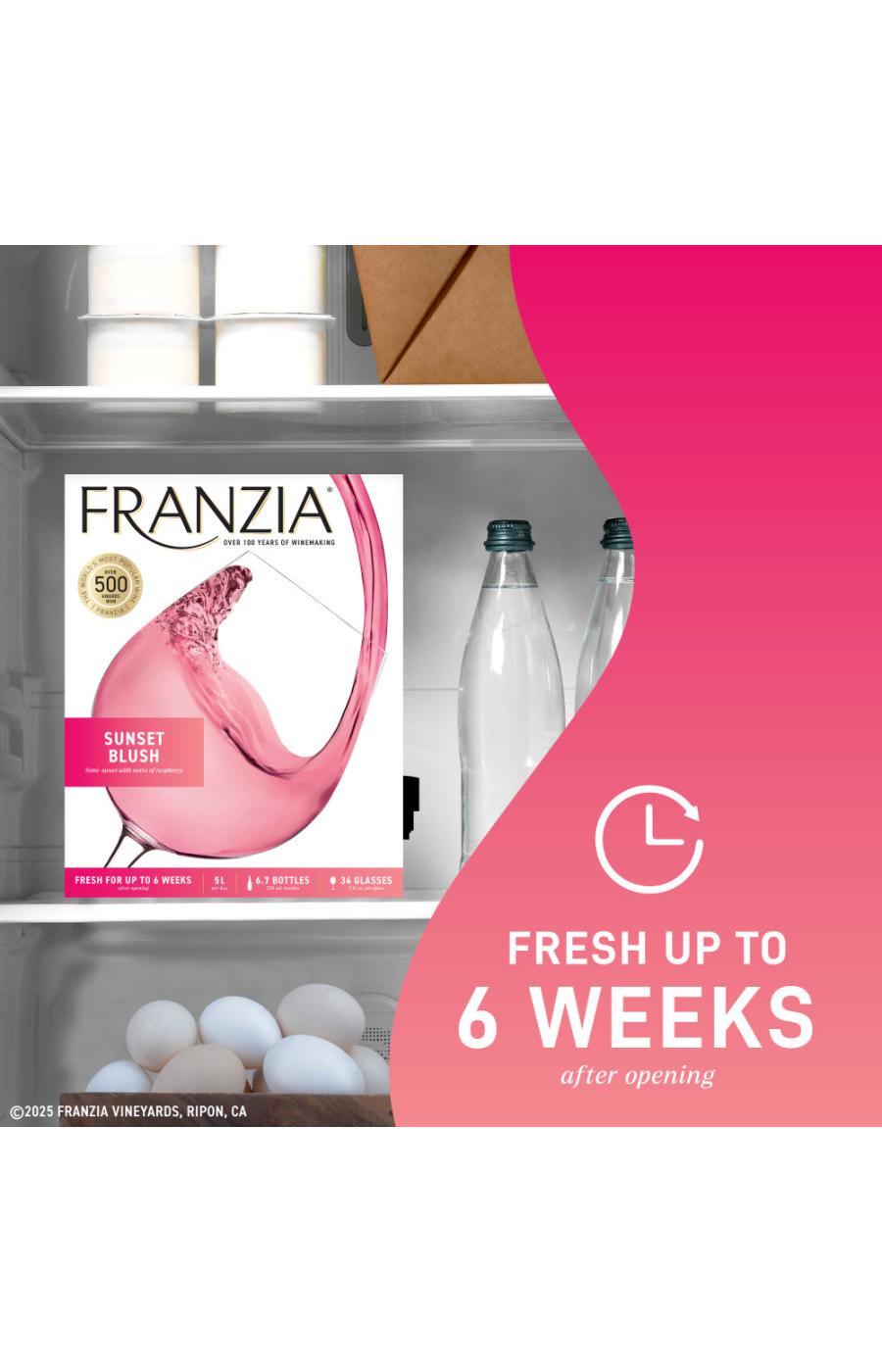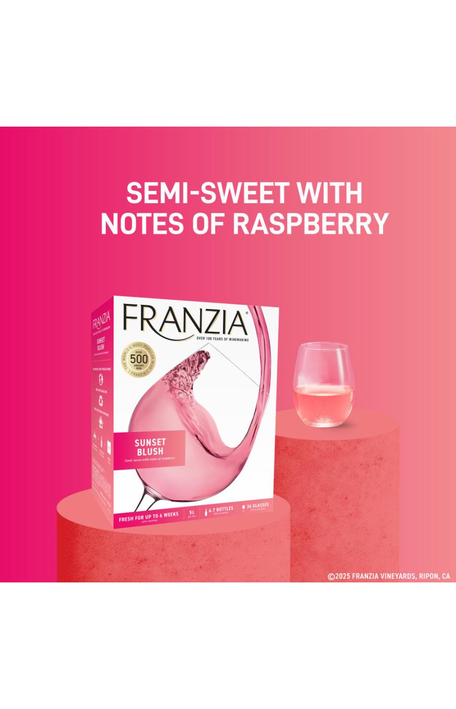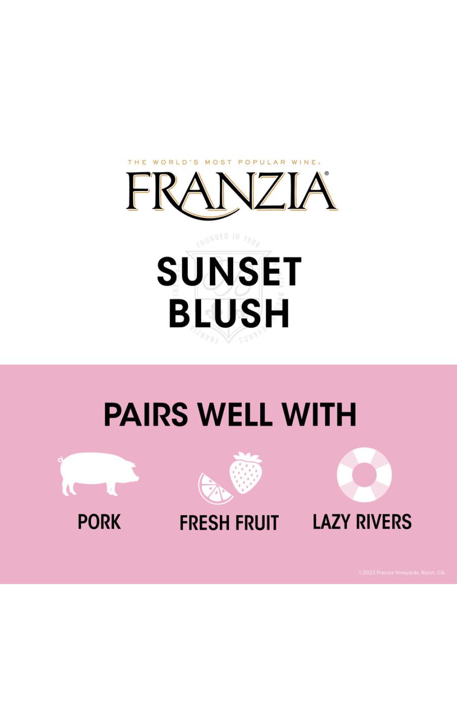 • Varietal: Blend-Other• Type: Rose Wine-Blend• Origin: United States• Tasting Notes: Franzia Sunset Blush is semi-sweet and refreshing with red berry flavors• Pairings:• Size: 5.0 L• ABV: 9.00%Franzia Sunset Blush Pink Wine is a refreshing, semi-sweet wine with red berry notes. This light-bodied wine from the American appellation pairs well with pork and fresh fruit. With 9% ABV, it’s perfect for social gatherings. Each 5L box serves 34 five-ounce glasses and stays fresh for six weeks. Packaging may vary for a limited time. Keep refrigerated and serve chilled for full flavor.