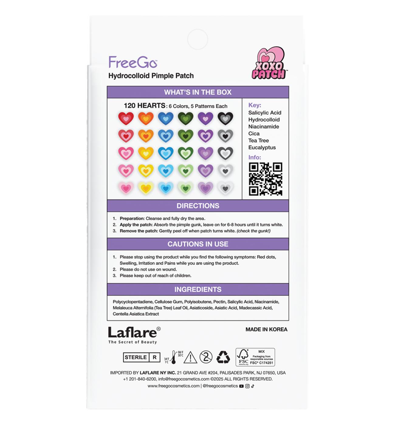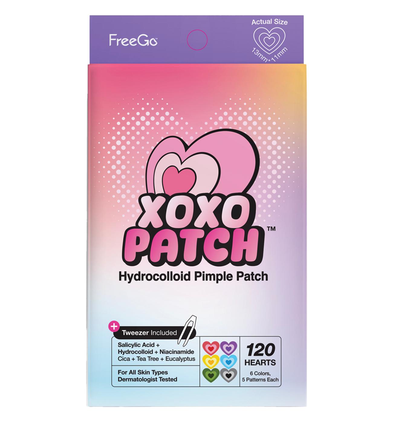 FreeGo XOXO Hydrocolloid Pimple Patch, 120 CountsCute Colorful Heart Shape Salicylic Acid, Niacinamide, CICA, Tea TreeAbsorb, Heal Pimple and Protect SkinVARIOUS COLORS & PATTERNSA triple heart-shaped pimple patch, your next pimple-fighting warrior!FreeGo XOXO Pimple Patch comes in a big pack of 120 pcs, including 6 colors and 5 patterns each: pink, yellow, green, purple, blue, and black.EFFECTIVE INGREDIENTSMade of medical-grade hydrocolloid from Korea, infused with Salicylic acid, Niacinamide, Cica, Tea tree, and Eucalyptus to absorb, protect, and heal pimples fast and effectively—no popping needed!INDIVIDUALLY PACKAGEDEach cute heart pimple patch sheet is individually packaged, and easy to peel off with a middle slit.It comes with an extra tweezer to stay hygienic while enjoying repairing your skin.FOR EVERYONE, ALWAYSExpress yourselves with the XOXO Patch, pick the cute heart patch depending on your mood that day, the outfit, or the aesthetic you are going for while protecting and repairing your skin.VEGAN & DERMATOLOGIST-TESTEDFreeGo is 100% vegan, cruelty-free, and dermatologist-tested.Gentle on all skin types and No animal testing.