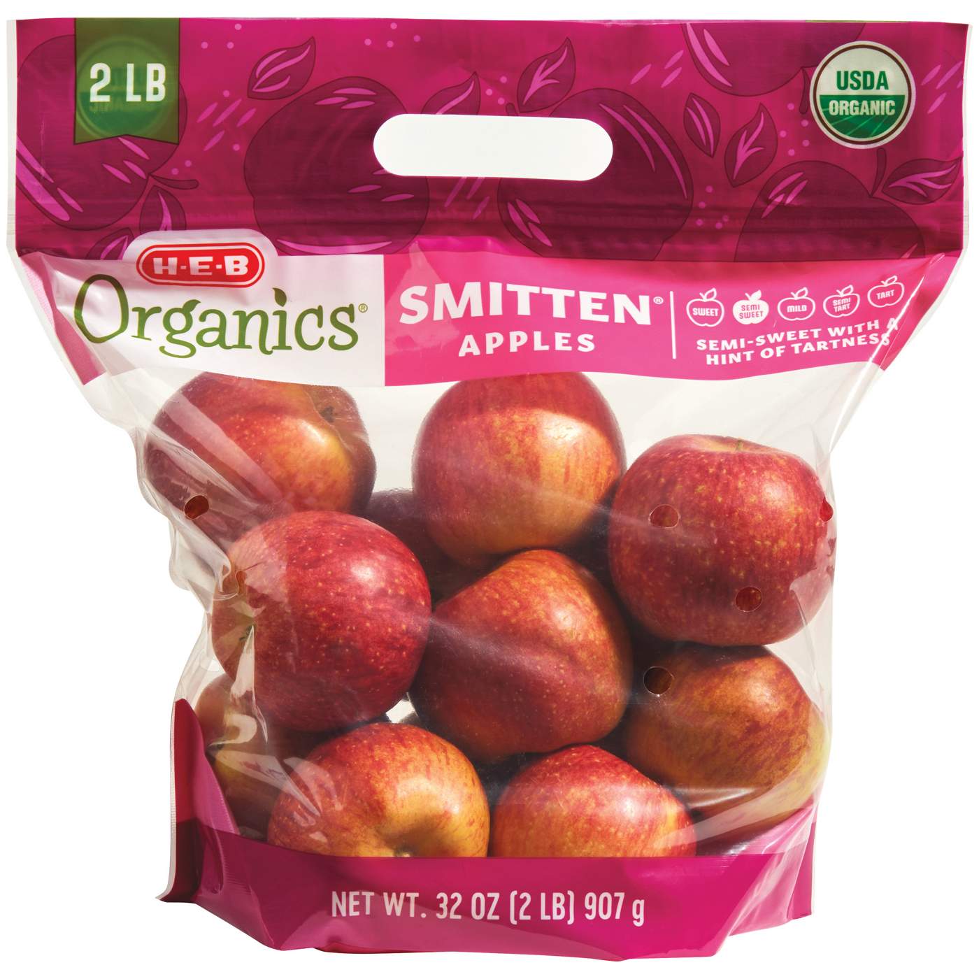 Once bitten, forever smitten! Semi-sweet with a hint of tartness, H-E-B Organics Smitten apples are mainly red with bursts of yellow peeking through, and have a sugary-tart crunch in every bite. Enjoy this apple variety on its own or sliced into wedges and snacked on with cheese or nuts.