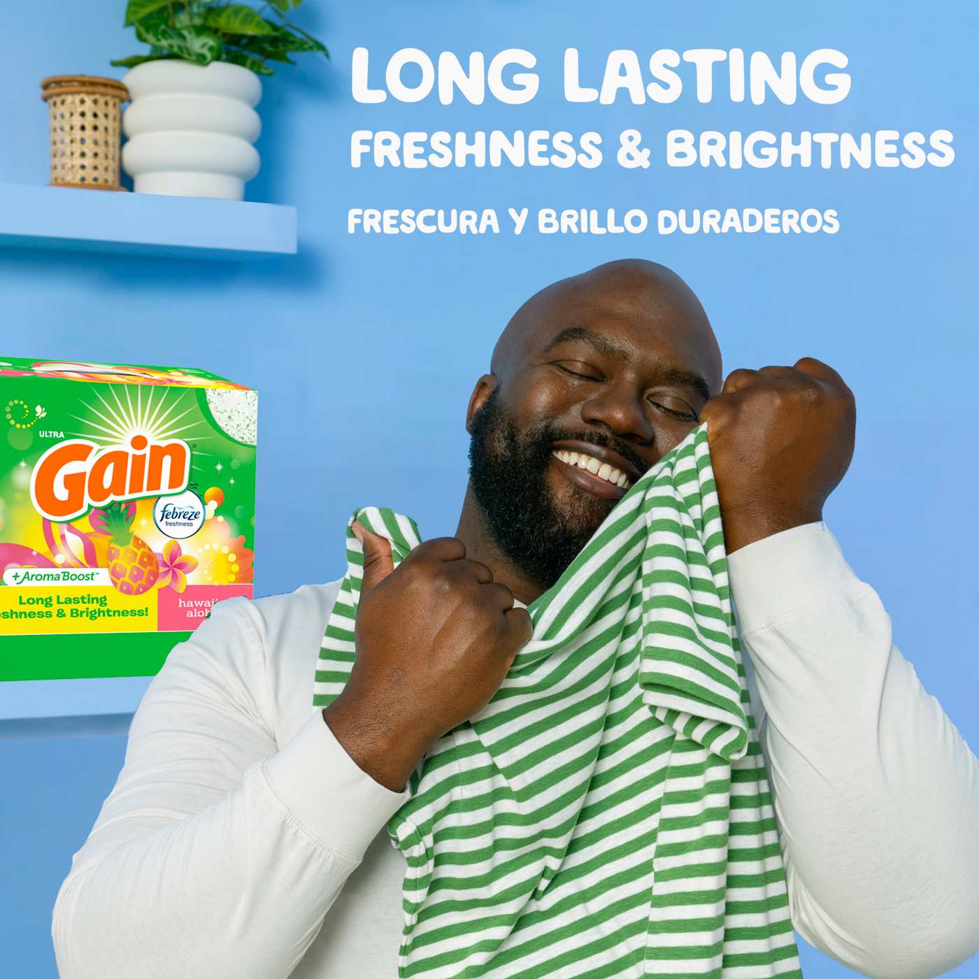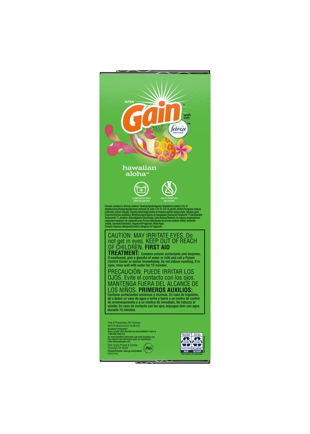 For long-lasting freshness and brightness, try Gain Hawaiian Aloha Powder Laundry Detergent. This powerful laundry detergent is infused with AromaBoost technology, ensuring that your clothes not only get clean but also smell amazing for weeks. Gain Powder is specially formulated to tackle tough stains while providing a delightful scent that lingers long after washing.Safe for both regular and high-efficiency machines, Gain Hawaiian Aloha Powder Detergent is easy to use. Simply add the recommended amount of Gain Powder Detergent to the drum, toss in your laundry, and start your wash cycle. Experience the joy of fresh, clean clothes with the delightful scent of Gain Hawaiian Aloha that you love. For an even more intense fragrance, consider pairing it with Gain Fireworks Scent Beads and Gain Fabric Softener. With Gain, your laundry will not only look clean but also smell fantastic.