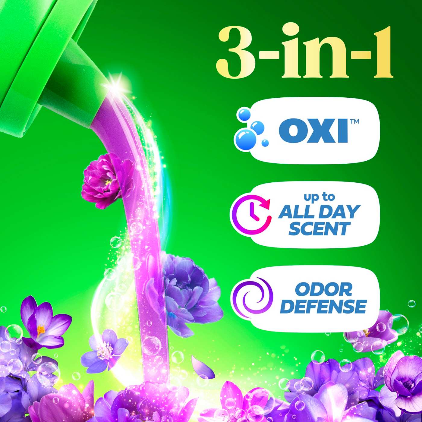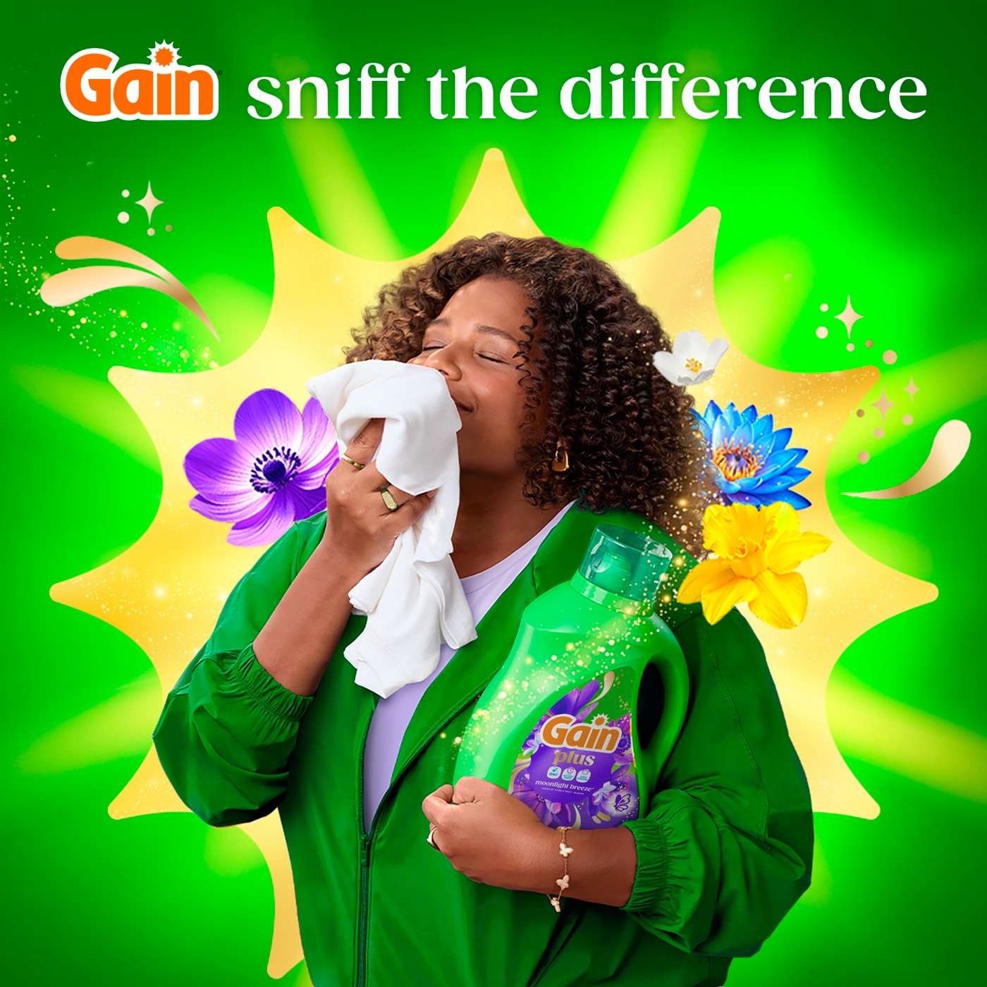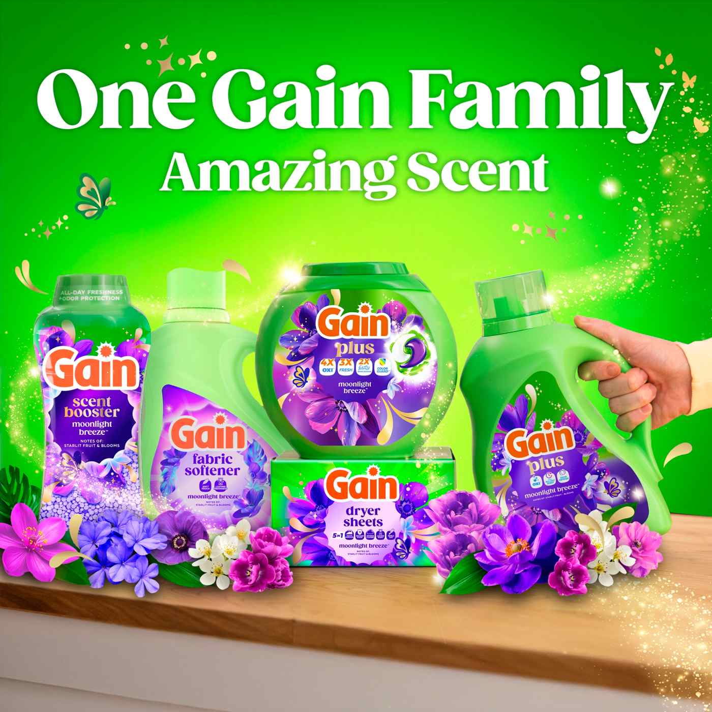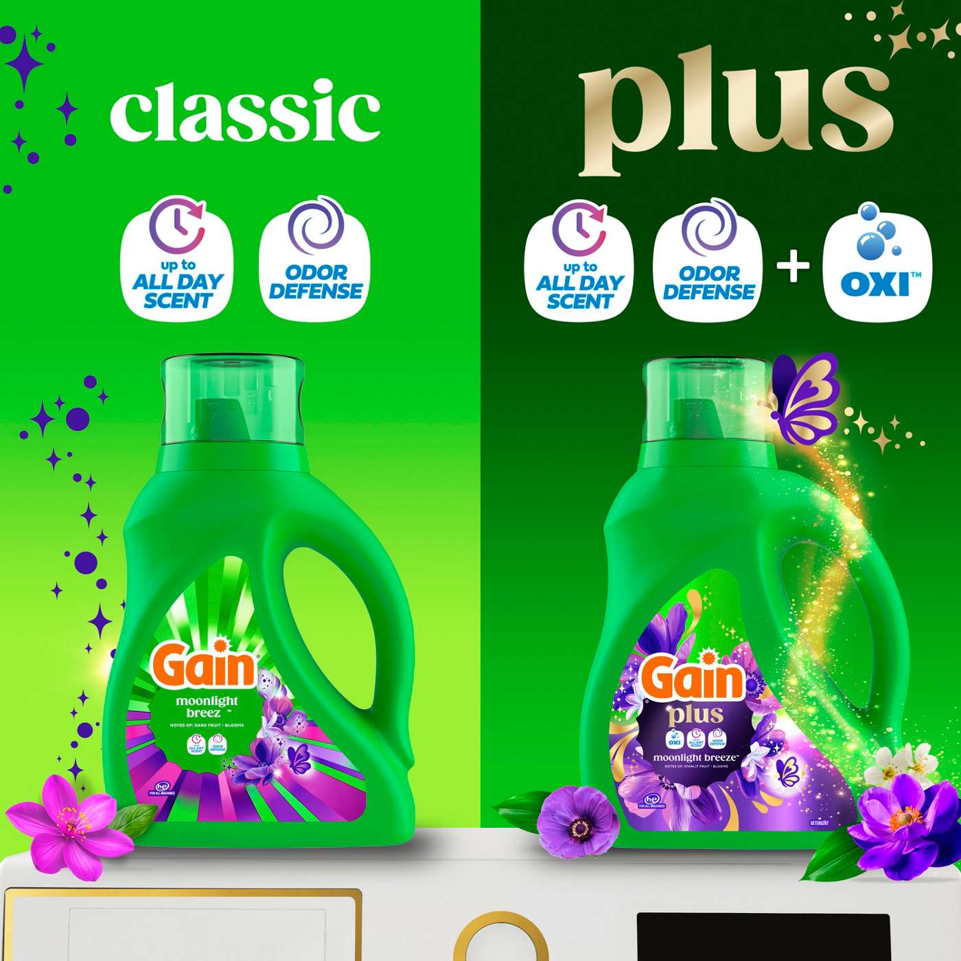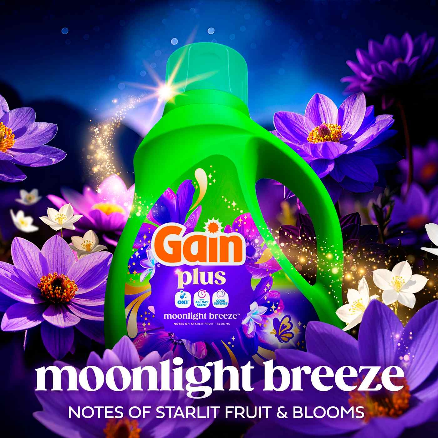 Experience a superior clean and lasting freshness with Gain Plus Liquid Washing Detergent. The Gain Plus liquid washing detergent is expertly formulated to deliver powerful stain removal while infusing your laundry with the iconic Gain Plus Original scent. This Gain Plus liquid laundry soap harnesses the power of Oxi for a 3-in-1 washing solution: Oxi, Odor Defense, and up to All Day Scent benefits, ensuring your clothes come out cleaner, fresher, and bursting with fragrance. Gain Plus liquid washing detergent is designed to fight the funk and tackle frustrating odors, so your laundry always smells inviting. With the addition of Oxi, this liquid washing detergent brings enhanced cleaning power compared to classic Gain Original, making it perfect for busy households. The Gain Plus liquid laundry soap works in all machines and water conditions, providing flexibility and convenience for every laundry routine. Moonlight Breeze Scent is a captivating fragrance that intertwines the luscious richness of dark fruits with the enchanting sweetness of blooming florals, evoking a sense of deep elegance and allure - Sniff the Difference. Includes one 60 fl oz jug of Gain Plus Liquid Laundry Detergent in Moonlight Breeze Scent, good for 45 Medium Loads.