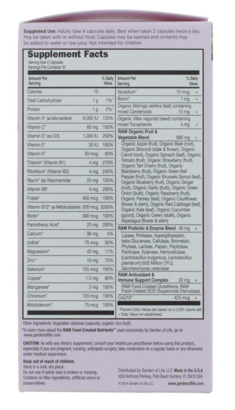 Vanadium, Boron, Organic Moringa (leaf) containing mixed Carotenoids, Organic Vitex (seed) containing mixed Tocopherols, RAW Organic Fruit & Vegetable Blend: Organic Apple (fruit), Organic Beet (root), Organic Broccoli (stalk & flower), Organic Carrot (root), Organic Spinach (leaf), Organic Tomato (fruit), Organic Strawberry (fruit), Organic Tart Cherry (fruit), Organic Blackberry (fruit), Organic Green Bell Pepper (fruit), Organic Brussels Sprout (leaf), Organic Blueberry (fruit), Organic Ginger (root), Organic Garlic (bulb), Organic Green Onion (bulb), Organic Raspberry (fruit), Organic Parsley (leaf), Organic Cauliflower (flower & stem), Organic Red Cabbage (leaf), Organic Kale (leaf), Organic Cucumber (gourd), Organic Celery (stalk), Organic Asparagus (flower & stem) RAW Probiotic & Enzyme Blend: Lipase, Protease, Aspergillopepsin, beta-Glucanase, Cellulase, Bromelain, Phytase, Lactase, Papain, Peptidase, Pectinase, Xylanase, Hemicellulase, [Lactobacillus bulgaricus, Lactobacillus plantarum] (500 Million CFU), Saccharomyces cerevisiae, RAW Antioxidant & Immune Support Complex: RAW Food-Created Glutathione, RAW Food-Created SOD (Superoxide Dismutase), CoQ10, Vegetable cellulose (capsule), organic rice (hull).Allergens and safety warnings