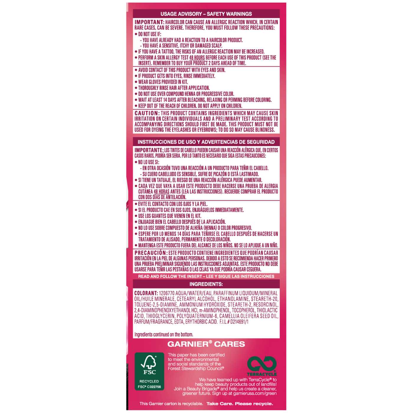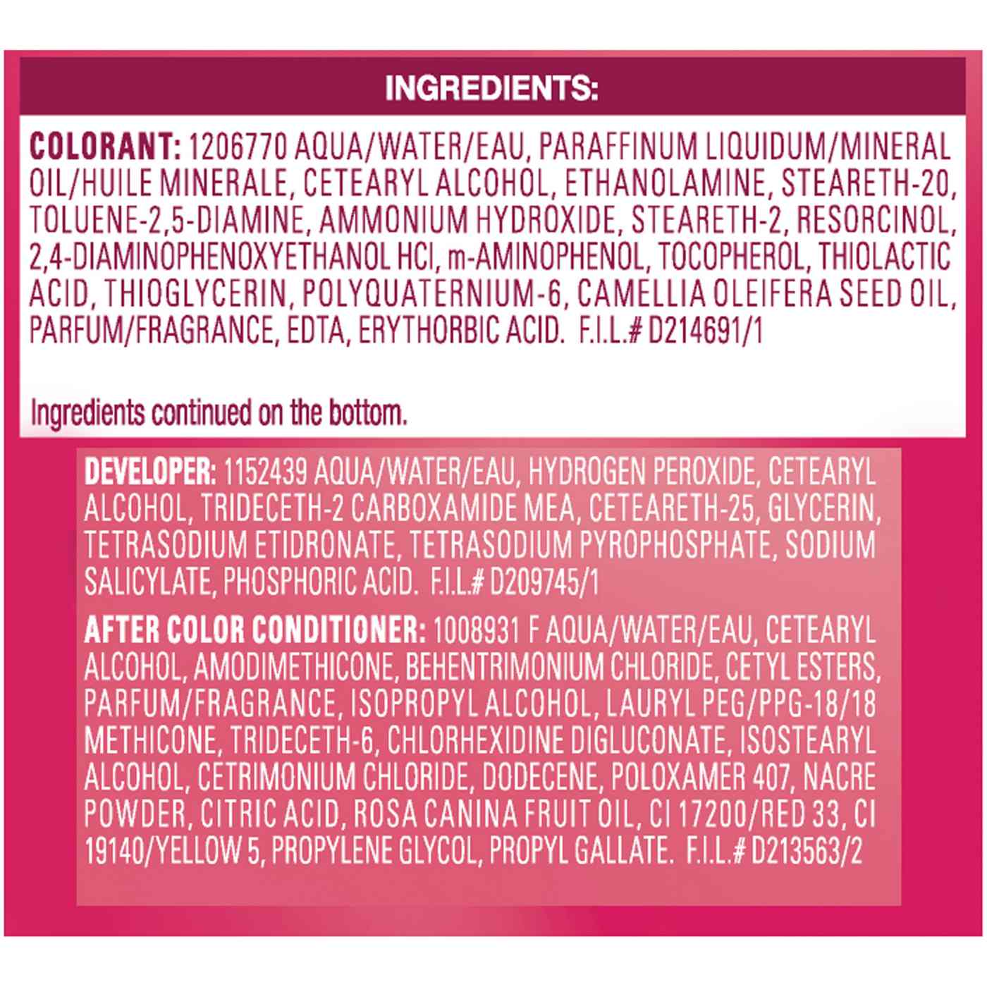 Developer: 178914 U Aqua/Water/Eau, Hydrogen Peroxide, Cetearyl Alcohol, Trideceth-2 Carboxamide Mea, Ceteareth-25, Glycerin, Pentasodium Pentetate, Sodium Stannate, Tetrasodium Pyrophosphate, Phosphoric Acid. F.I.L.# D12836/26 Colorant: 1126021 Aqua/Water/Eau, Paraffinum Liquidum/Mineral Oil/Huile Minerale, Cetearyl Alcohol, Ethanolamine, Steareth-20, Toluene-2,5-Diamine, Ammonium Hydroxide, Steareth-2, Resorcinol, 2,4-Diaminophenoxyethanol Hcl, M-Aminophenol, Tocopherol, Thiolactic Acid, Thioglycerin, Polyquaternium-6, Camellia Oleifera Seed Oil, Pentasodium Pentetate, Parfum/Fragrance, Erythorbic Acid. F.I.L.# D179103/1 Rinse-Out Conditioner: 1100858 Aqua/Water/Eau, Cetearyl Alcohol, Elaeis Guineensis Oil/Palm Oil, Behentrimonium Chloride, Pyrus Malus Extract/Apple Fruit Extract, Glycerin, Parfum/Fragrance, Isopropyl Alcohol, Stearamidopropyl Dimethylamine, Niacinamide, Pyridoxine Hcl, Butyrospermum Parkii Butter/Shea Butter, Citric Acid, Olea Europaea Oil/Olive Fruit Oil, Saccharum Officinarum Extract/Sugar Cane Extract/Extrait De Canne A Sucre, Benzyl Alcohol, Chlorhexidine Dihydrochloride, Persea Gratissima Oil/Avocado Oil, Ribes Nigrum Oil/Black Currant Seed Oil, Linalool, Citrus Medica Limonum Peel Extract/Lemon Peel Extract, Ci 19140/Yellow 5, Camellia Sinensis Leaf Extract, Ci 15985/Yellow 6. F.I.L.# D174455/2Allergens and safety warnings