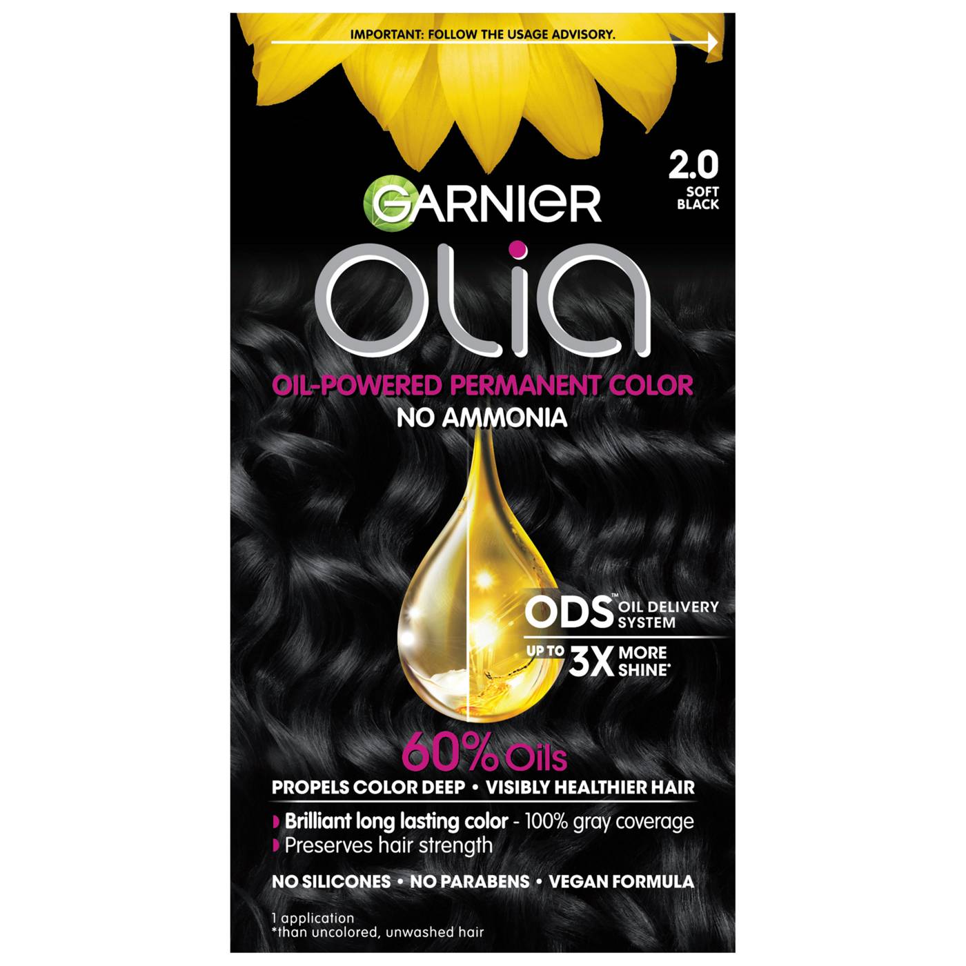 Experience a natural-looking soft black shade with Garnier Olia Oil Powered Hair Color in 2.0 Soft Black. This permanent hair color is ammonia-free, making it gentle on your hair and scalp. The oil-powered formula helps you enjoy a beautiful, shiny, and long-lasting color from an easy-to-use kit.• Permanent hair color• Color: 2.0 Soft Black• Ammonia-free• Oil-powered color