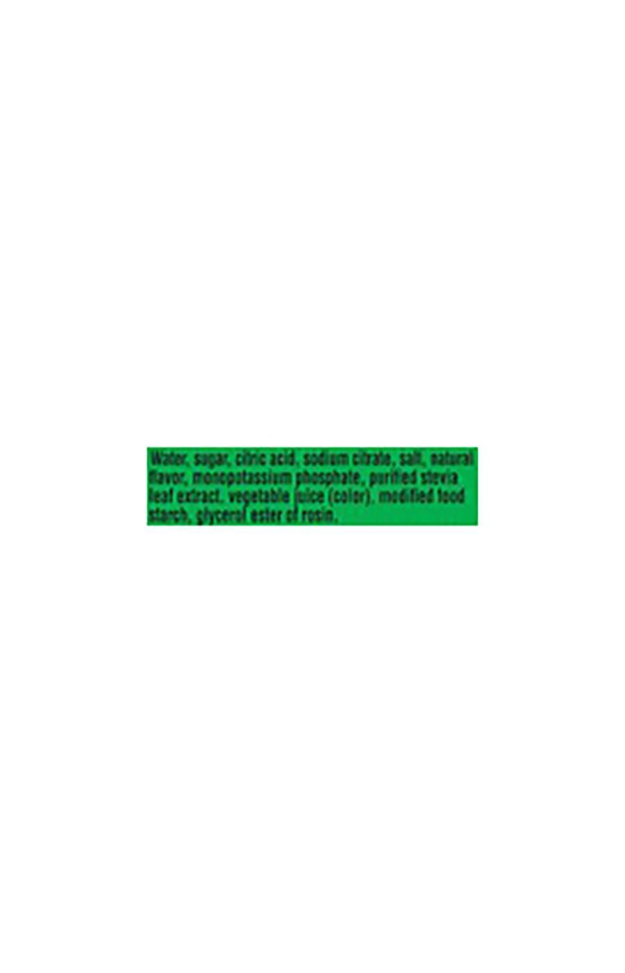 Water, Sugar, Citric Acid, Sodium Citrate, Salt, Natural Flavor, Monopotassium Phosphate, Purified Stevia Leaf Extract, Vegetable Juice (Color), Modified Food Starch, Glycerol Ester of Rosin.