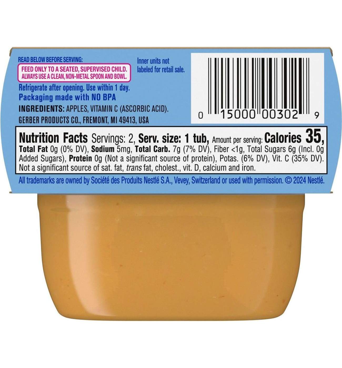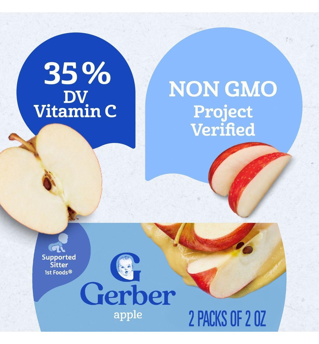 • ON THE GO BABY FOOD: Gerber Stage 1 Baby Food Puree Tubs are designed for ease and convenience. These tubs are the perfect on the go baby food, made in a portable and easy-to-store format for busy parents• NUTRITIOUS: This baby food tub has 35% of the daily value of vitamin C• STAGE 1 BABY FOOD: These stage one baby puree tubs have been designed for babies who are able to sit with help or support and are ready to start solids, making it a great addition to your baby's diet• BABY FOOD PUREE: There is 1/3 apple in each tub. The apple is finely pureed to ensure a smooth and enjoyable eating experience for your baby• NO ARTIFICIAL COLORS OR FLAVORS: With no added sweeteners, and no artificial colors or flavors, you and your baby can feel good about this baby food puree• TRUSTED FAMILY FAVORITE: We are leading the way in quality and testing standards for babies. Our dedication to quality ensures that your baby receives the finest food available. Gerber is a trusted choice for countless families