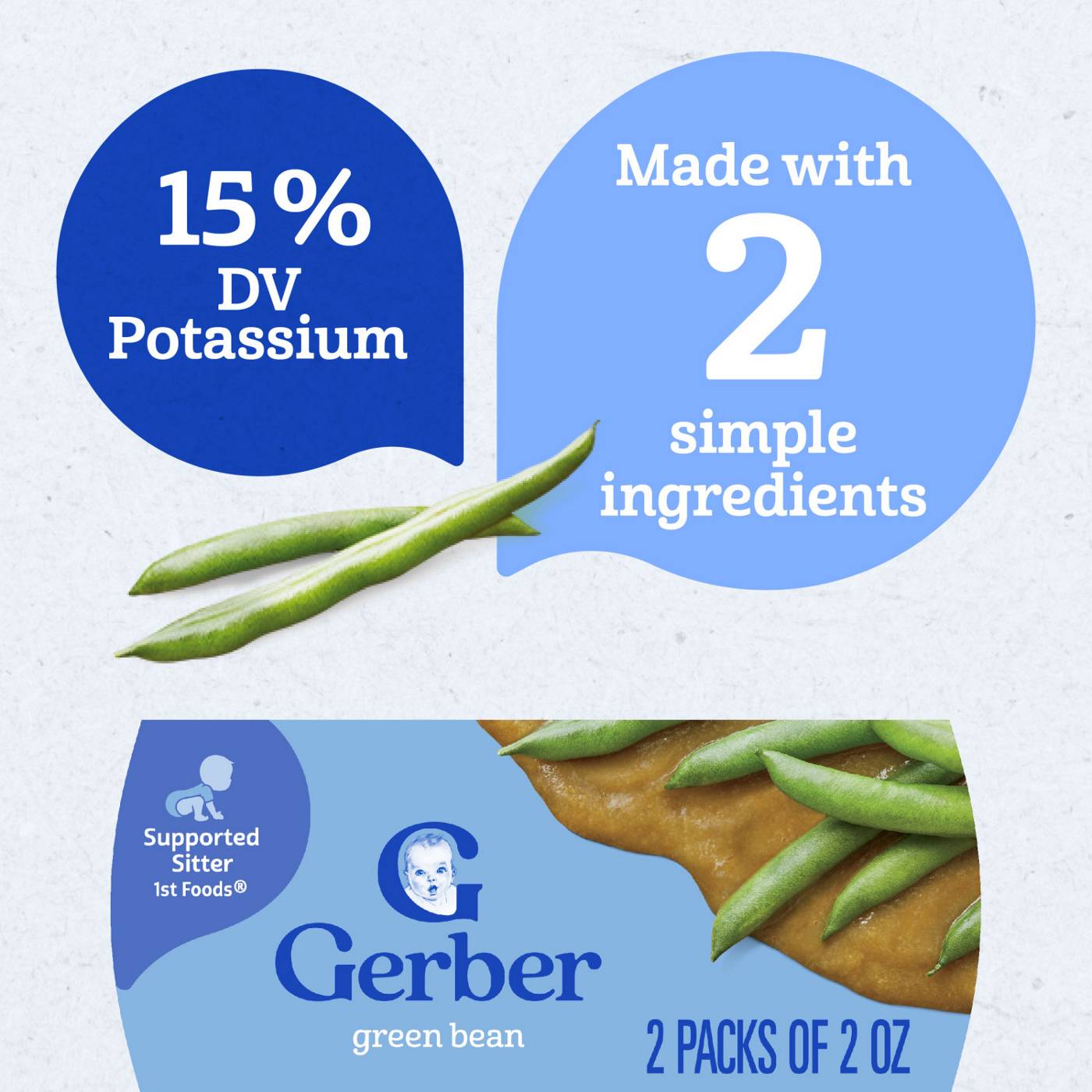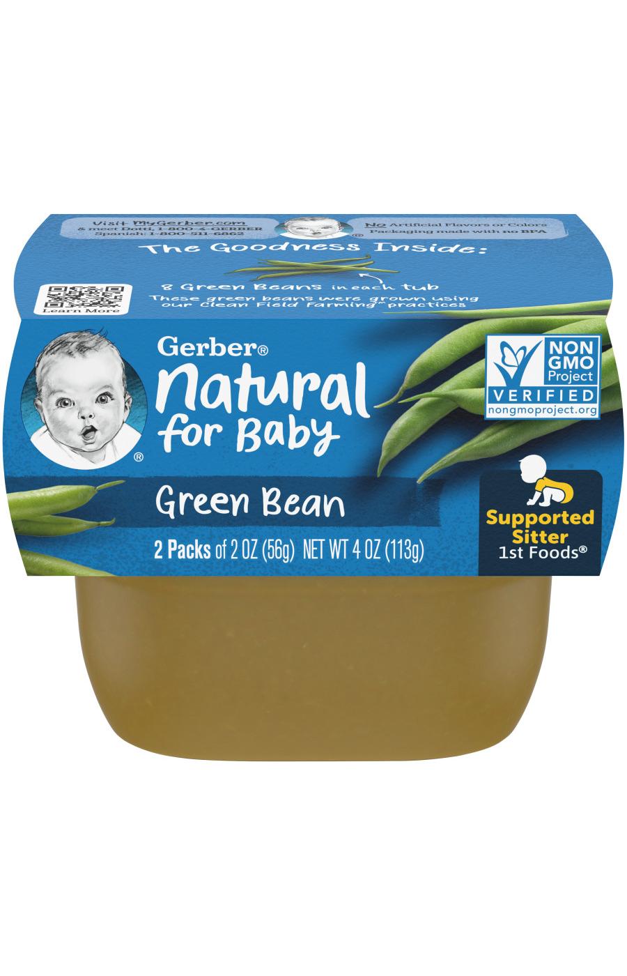 Start your baby’s love of veggies early with Gerber 1st Foods Green Bean Baby Food. Made with all natural veggies, this puree contains 14 green beans per tub and introduces your baby to a classic veggie flavor. The green beans that go into Gerber purees are grown using Clean Field Farming practices to ensure they're nutritious, wholesome and safe for every tiny tummy. Made with non-GMO ingredients, this Gerber baby food stage 1 recipe contains no artificial flavors, colors, added salt or added starch. The texture is just right for introducing solids to your little one, and single-variety fruits or veggies are ideal for introducing new tastes and checking for sensitivities. BPA-free plastic tubs keep this baby food fresh and offer convenient storage and portability. Feed your baby right from the tub, or spoon some into a bowl and refrigerate the leftovers for up to 2 days.