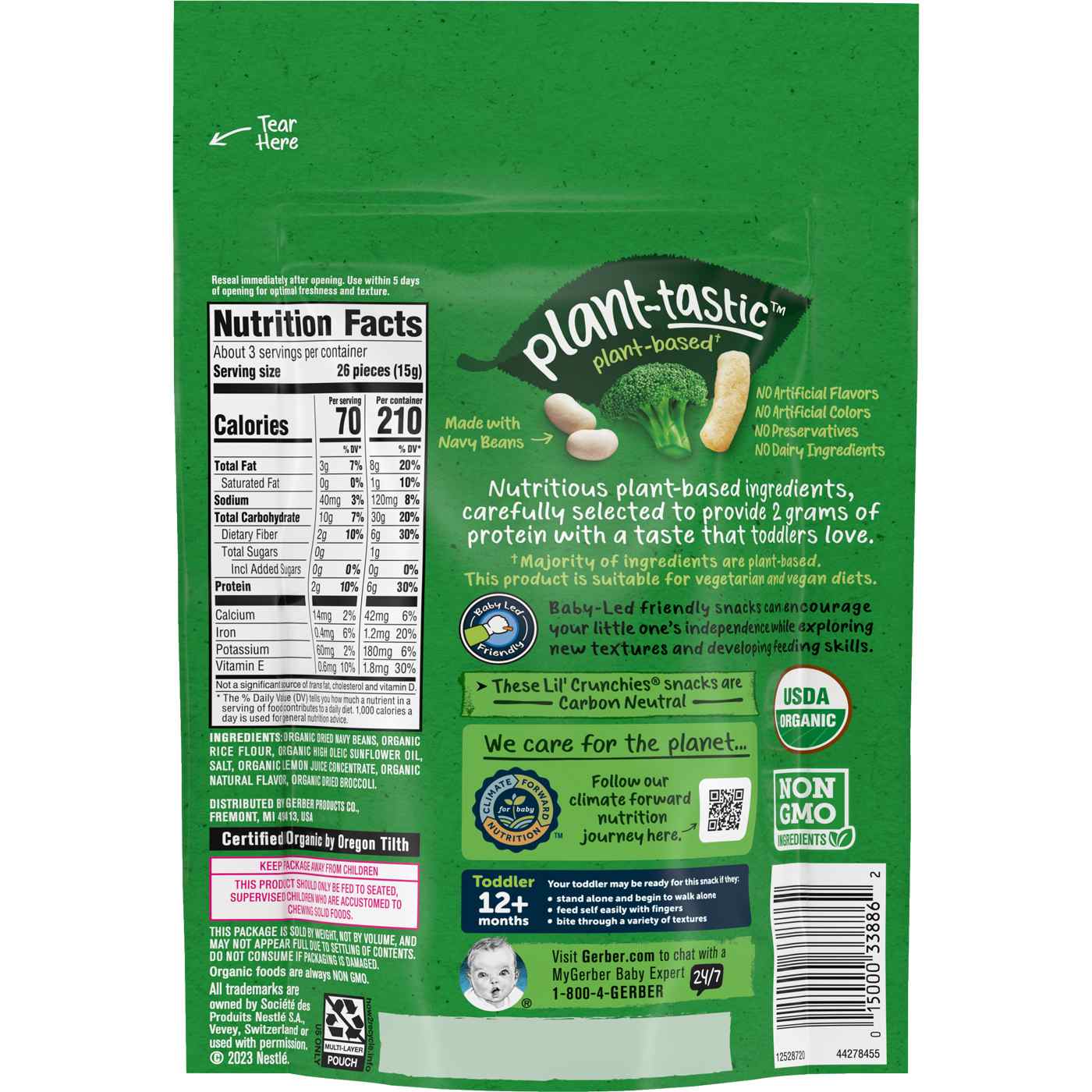 Gerber Organic Lil' Crunchies are a baked snack specially formulated to be developmentally and nutritionally appropriate for your toddler. Made with real navy beans, these snacks have a mild flavor and provide protein, making them a wholesome choice for your little one.