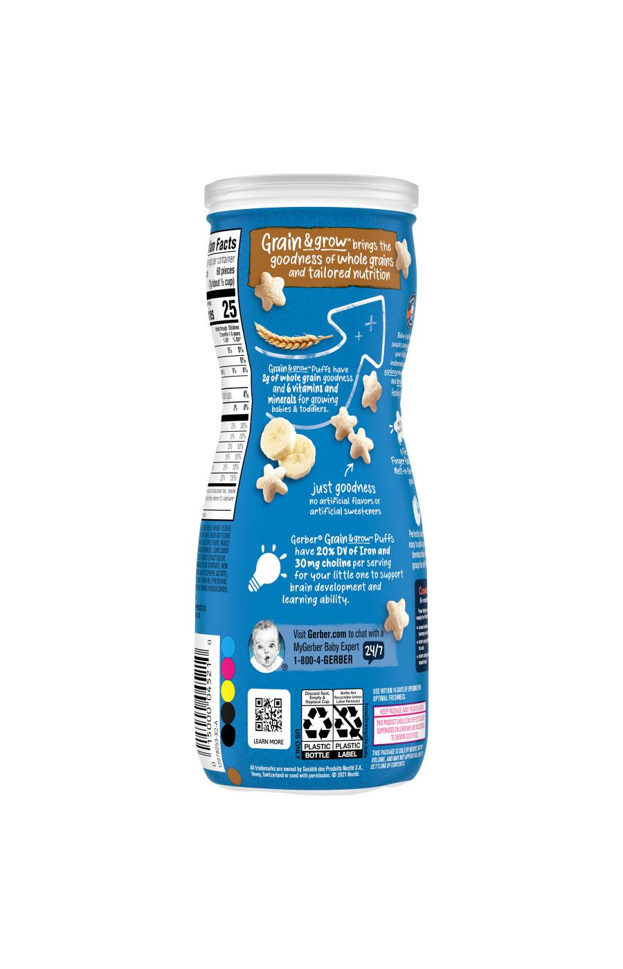 • BABY ESSENTIALS: Gerber Banana Puffs Snacks are thoughtfully crafted for busy parents who want to provide their little ones with a nutritious on-the-go option. Our baby snacks offer a practical solution for parents seeking both quality and convenience• NUTRITIOUS: This baby snack has 6 vitamins and minerals including 20% of the daily value of iron & choline, and 2g whole grains per serving• BABY FINGER FOOD: Baby led feeding puffs snacks are crafted to be easy to pick up and encourage your little one’s independence as they explore new tastes and textures• STAGE 3: Gerber Puffs snacks are a stage 3 baby food made for babies 8 months and older. Your little one may be ready for these baby puffs if they crawl without their tummy on the floor, start using their fingers to eat, or start using their jaw to mash food• NO ARTIFICIAL FLAVORS: These baby puffs have no artificial flavors and no artificial sweeteners. So, you and your little one can feel good about Gerber puffs• GROW WITH LOVE: Support your little one’s self-feeding journey with Gerber baby finger food, made for small hands and growing bodies. These baby snacks dissolve easily and taste great