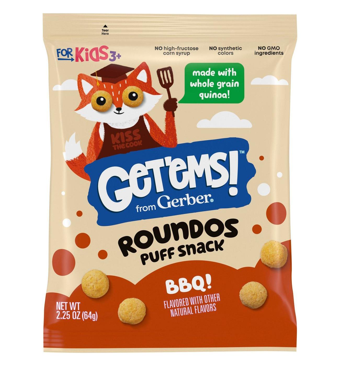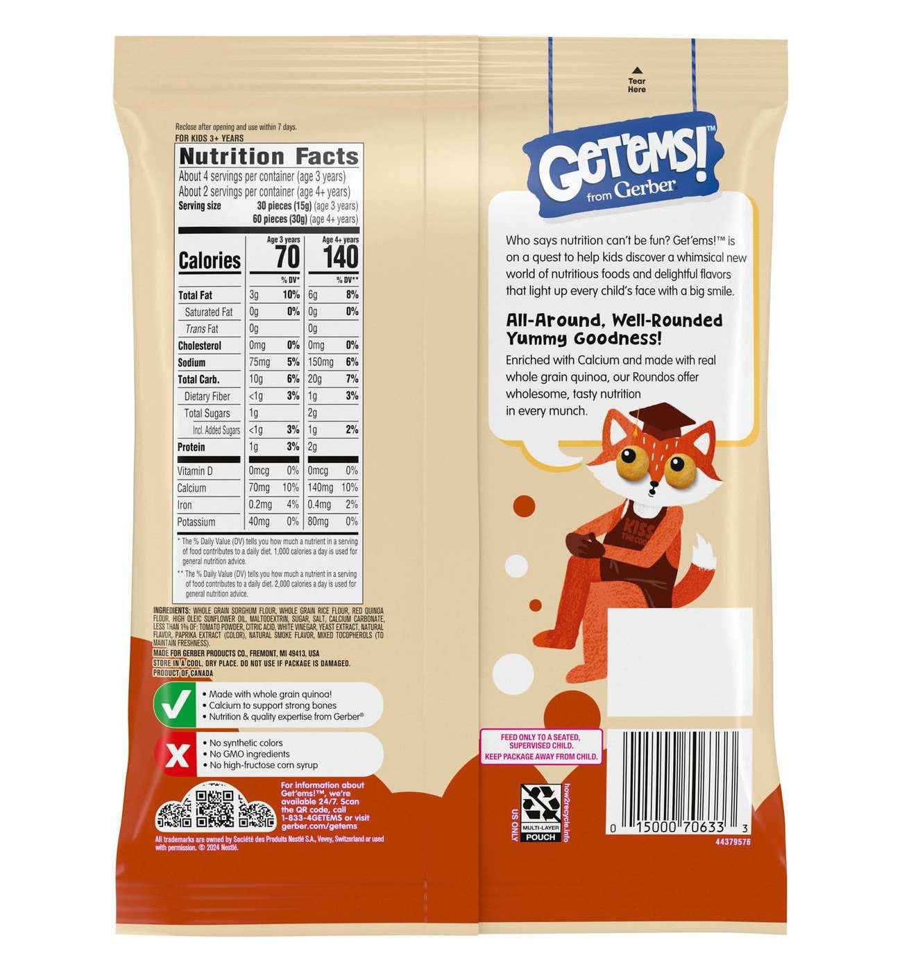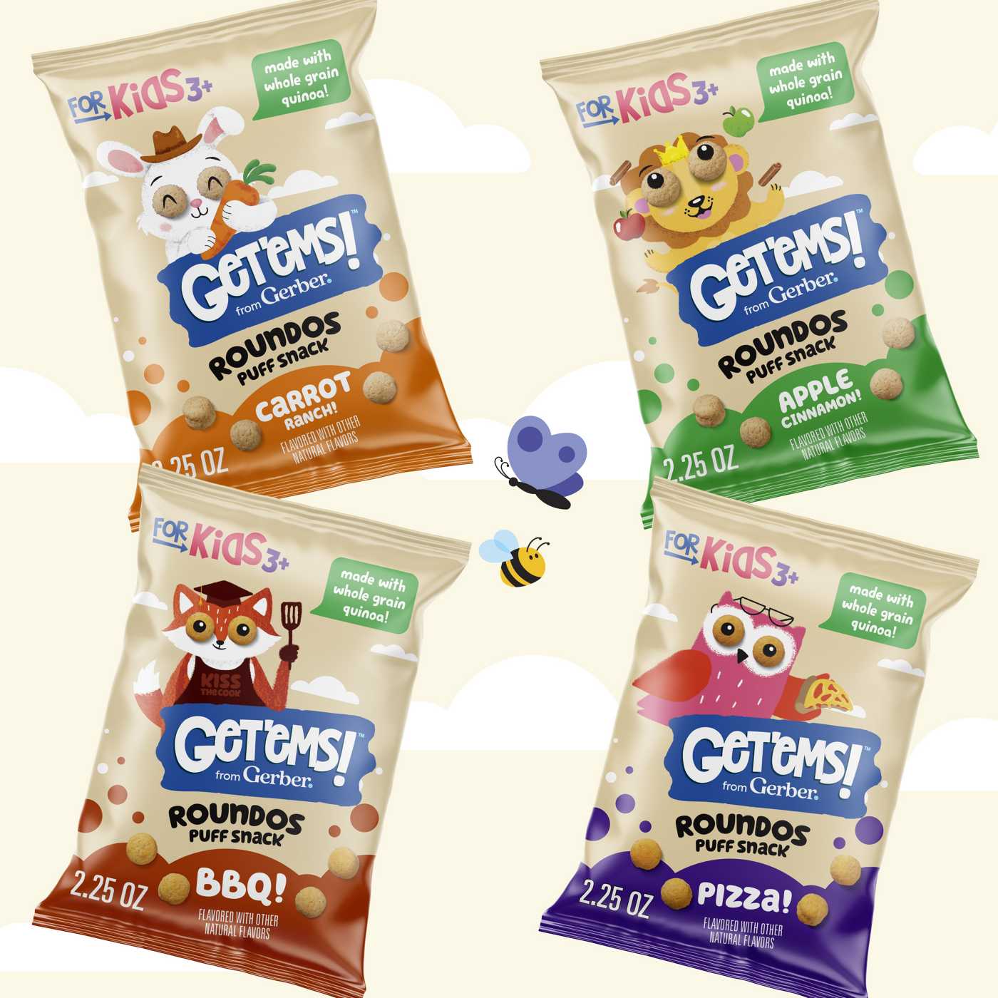 Introducing, GeT'eMS!™ from Gerber®. Who says nutrition can’t be fun? Get‘ems!™ is on a quest to help kids discover a whimsical new world of nutritious foods and delightful flavors that light up every child’s face with a big smile. Enriched with Calcium and made with real whole grain quinoa, our Roundos offer